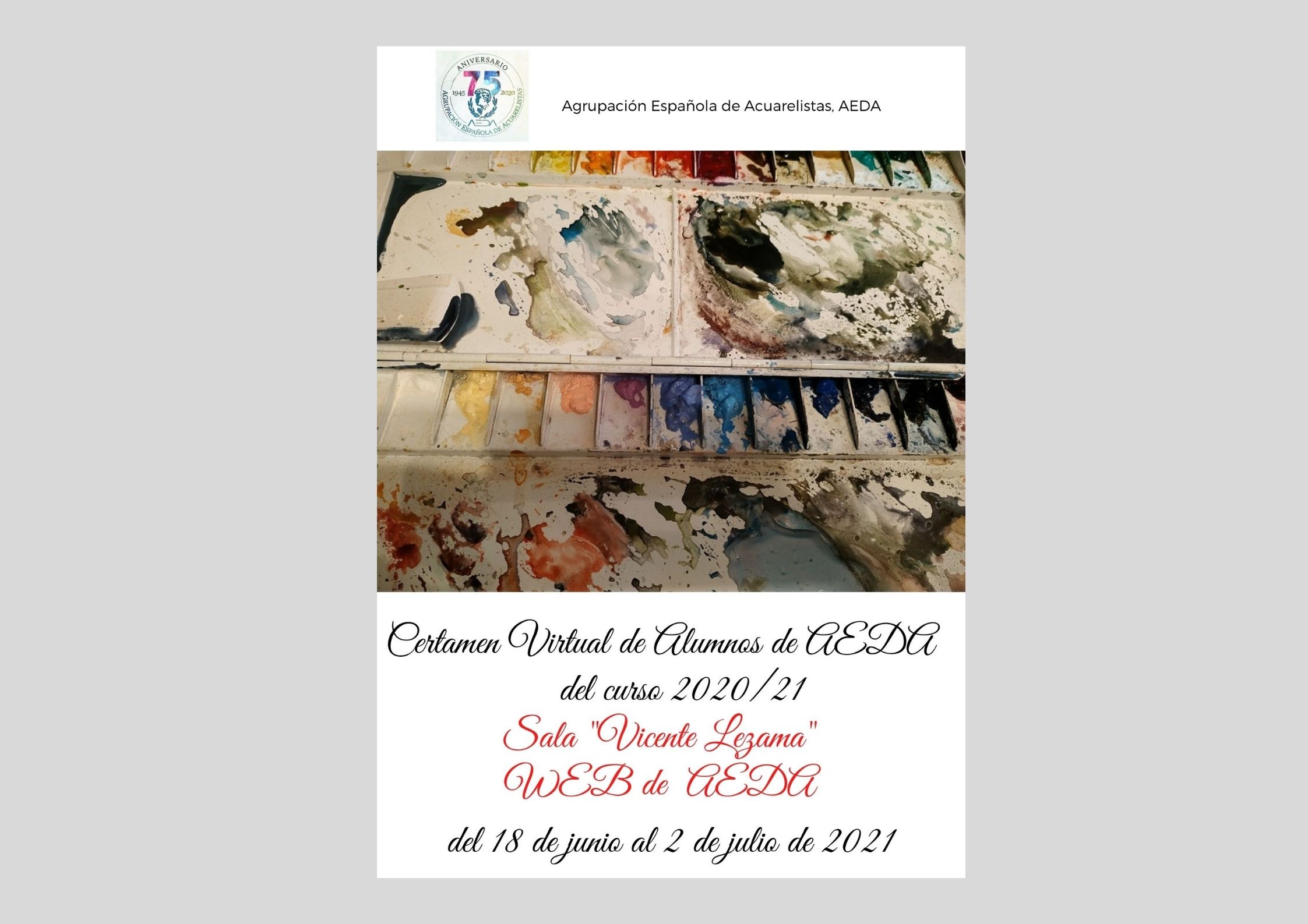 La Agrupación Española de Acuarelistas tiene el placer de invitaros a la inauguración de la exposición del 1er Certamen Virtual de ALUMNOS de AEDA, en la Sala Virtual “Vicente Lezama” de la página WEB de AEDA, que tendrá lugar este próximo viernes 18 de junio de 2021, a lo largo de todo el día. Estará disponible  hasta el 2 de julio de 2021.