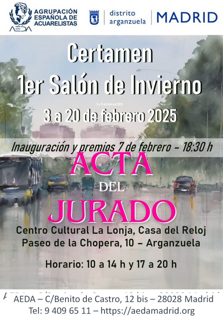 En Madrid, a 3 de febrero de 2025 a las 11 horas, de acuerdo con las Bases del I Certamen del invierno en AEDA, comienza la reunión del JURADO en la Casa del Reloj (Arganzuela) , sito en el Paseo de la Chopera, 10 de Madrid, compuesto por los siguientes miembros por orden alfabético: