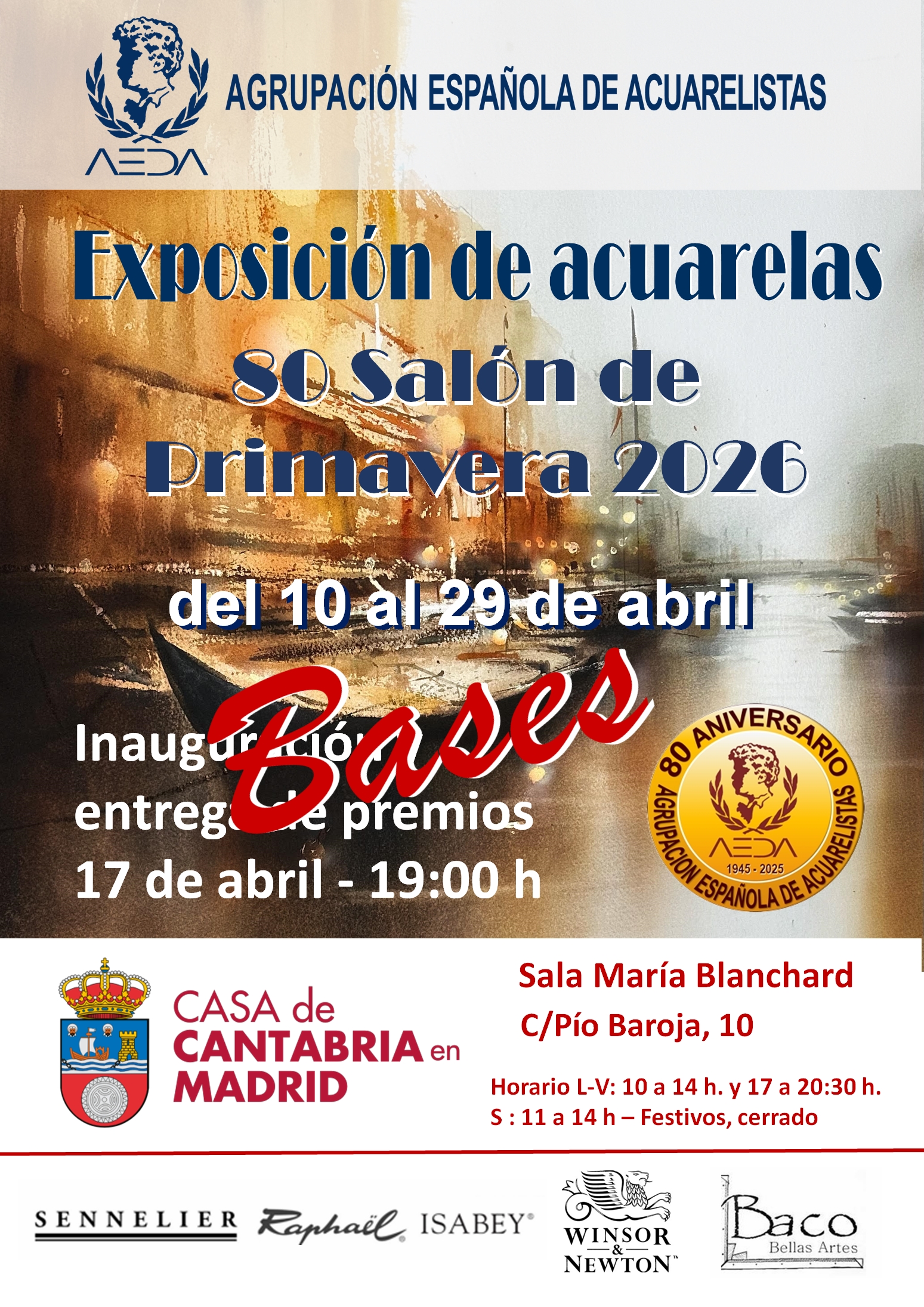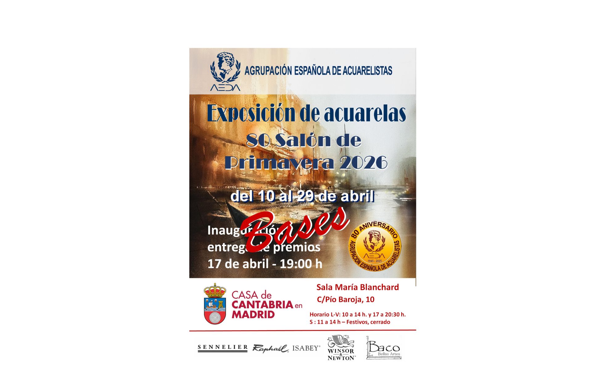 Nos complace presentaros las BASES de la Exposición de acuarelas del «80 Salón de Primavera de AEDA – 2026”, que va a tener lugar del 10 de marzo al 29 de abril de 2026 en la Sala de Exposiciones “María Blanchard” de la Casa de Cantabria, sita en c/ Pío Baroja 10 de Madrid.