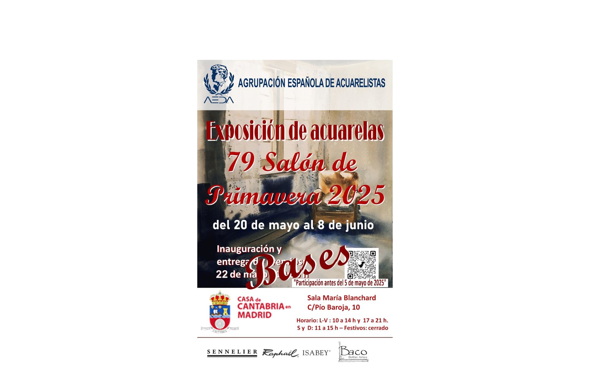 Nos complace presentaros las BASES del 79 Salón de Primavera – 2025 de AEDA que va a tener lugar del 20 de mayo al 8 de junio de 2025 en la Sala de Exposiciones «María Blanchard» de la Casa de Cantabria, sita en la c/ Pío Baroja 10 de Madrid.