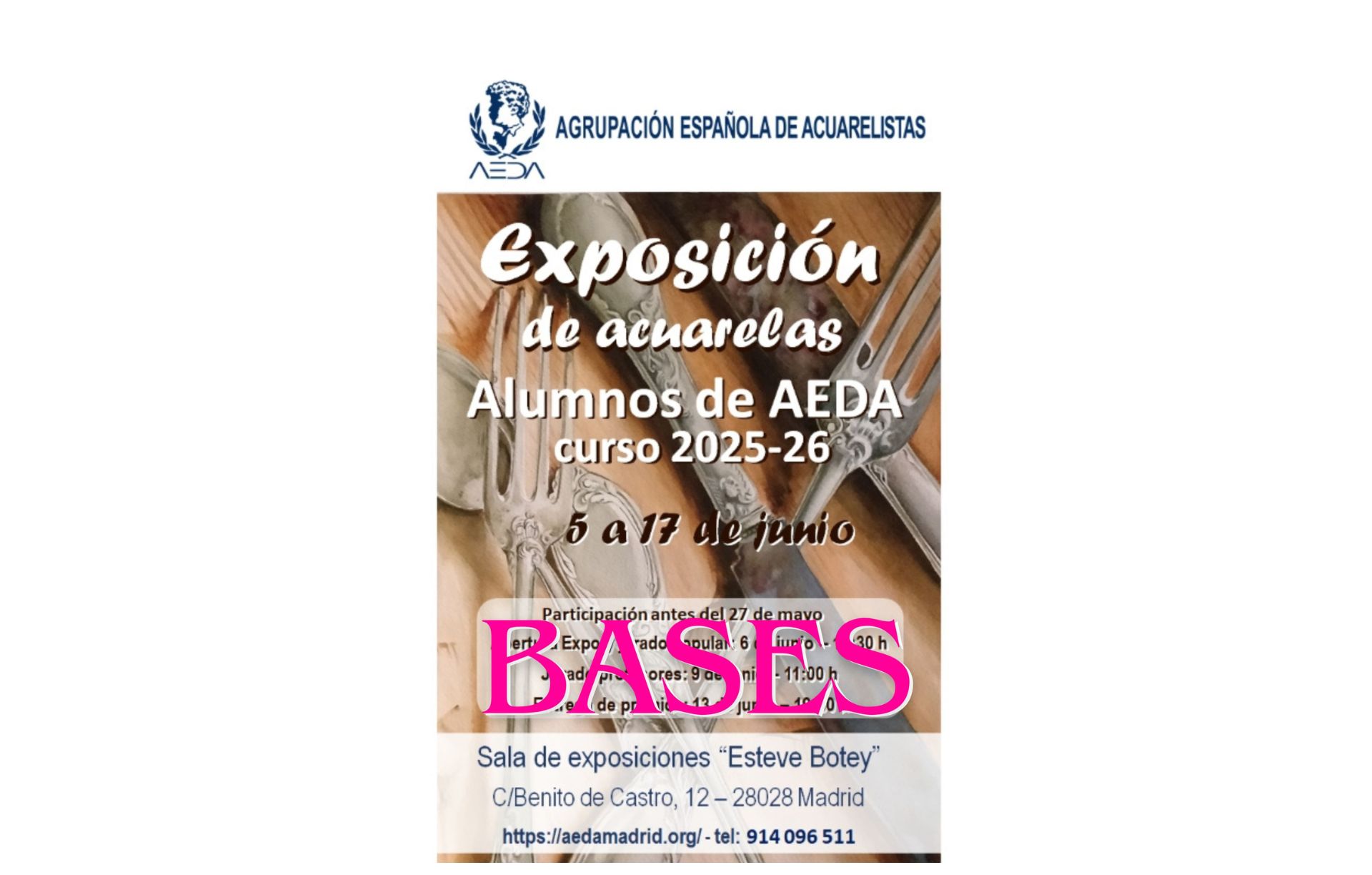 Nos complace presentaros las BASES de la exposición «Certamen de Alumos de AEDA del curso 2025-26”, que va a tener lugar del 5 al 17 de junio de 2026 en la Sala de Exposiciones “Estebe Botey” de la sede de AEDA, sita en c/ Benito de Castro 12, bajo izda, de Madrid.