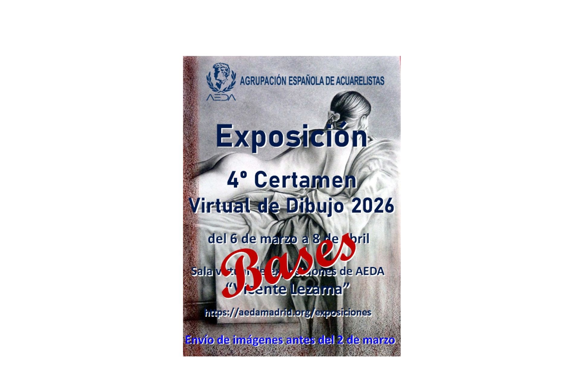Nos complace presentaros las BASES de la Exposición del «IV Certamen Virtual de DIBUJO de AEDA – 2026” que va a tener lugar del 6 de marzo al 8 de abril de 2026 en la Sala Virtual de Exposiciones «Vicente Lezama»de la página web de AEDA.