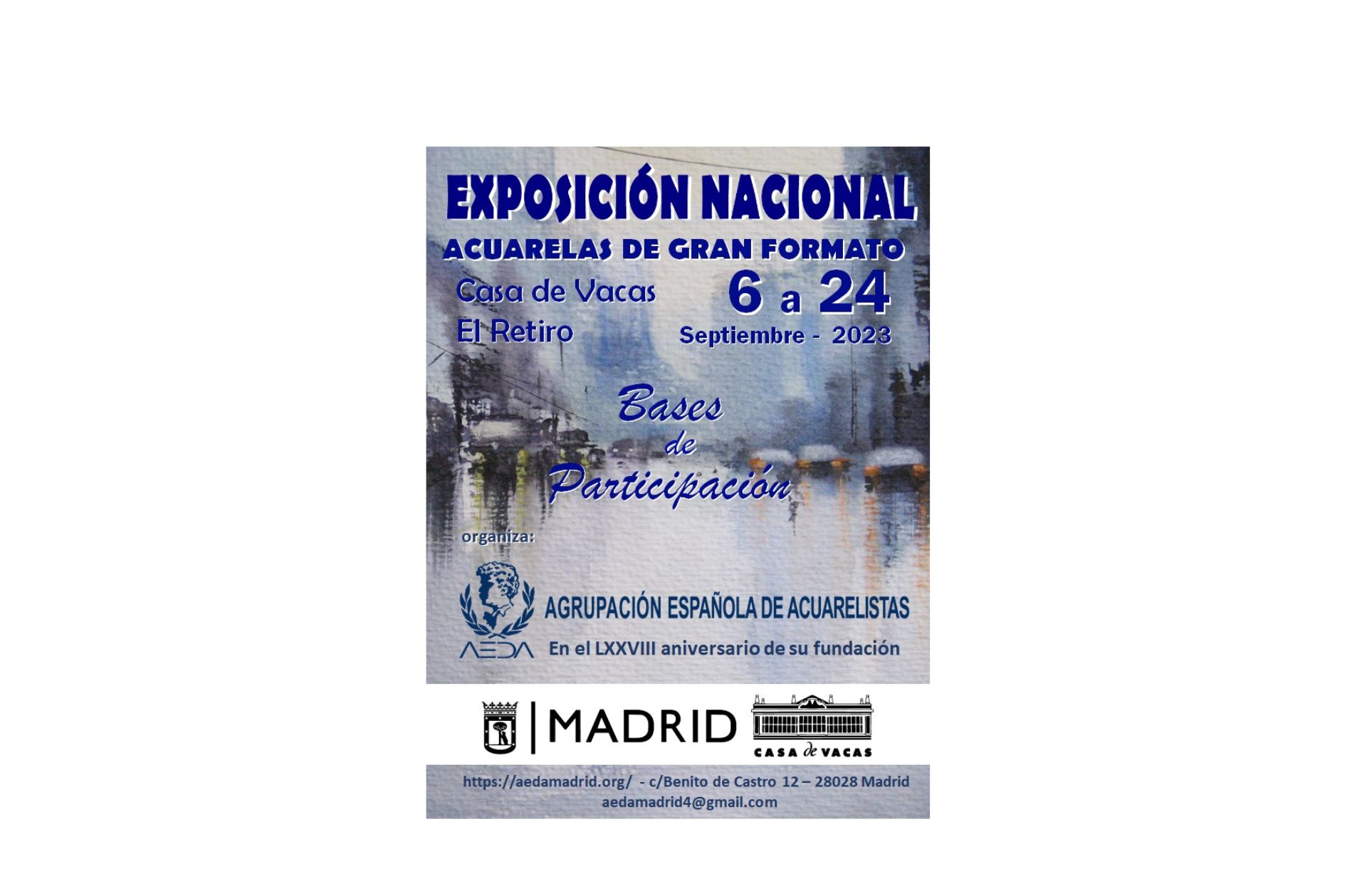 Queridos amigos, AEDA, en conmemoración del LXXVIII aniversario de su fundación, va a celebrar una «EXPOSICIÓN NACIONAL DE ACUARELAS DE GRAN FORMATO» en CASA de VACAS durante el mes de septiembre. La participación es libre y las obras serán seleccionadas por un jurado independiente.