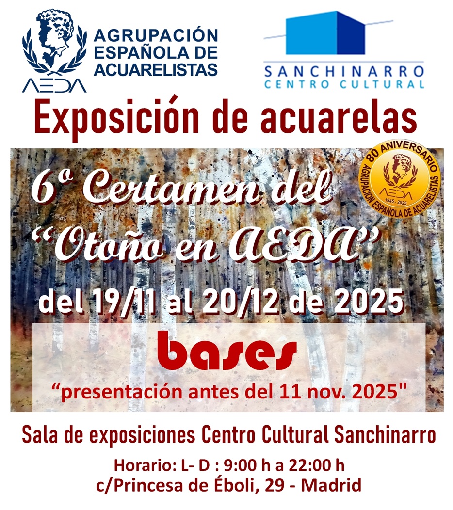 Nos complace acompañaros las BASES para el «VI Certamen del Otoño de AEDA«»« que va a tener lugar del 19 de noviembre al 20 de diciembrede 2025 en la Sala de Exposiciones del Centro Cultural Sanchinarro, sito en c/ Princesa de Éboli 29, de Madrid.