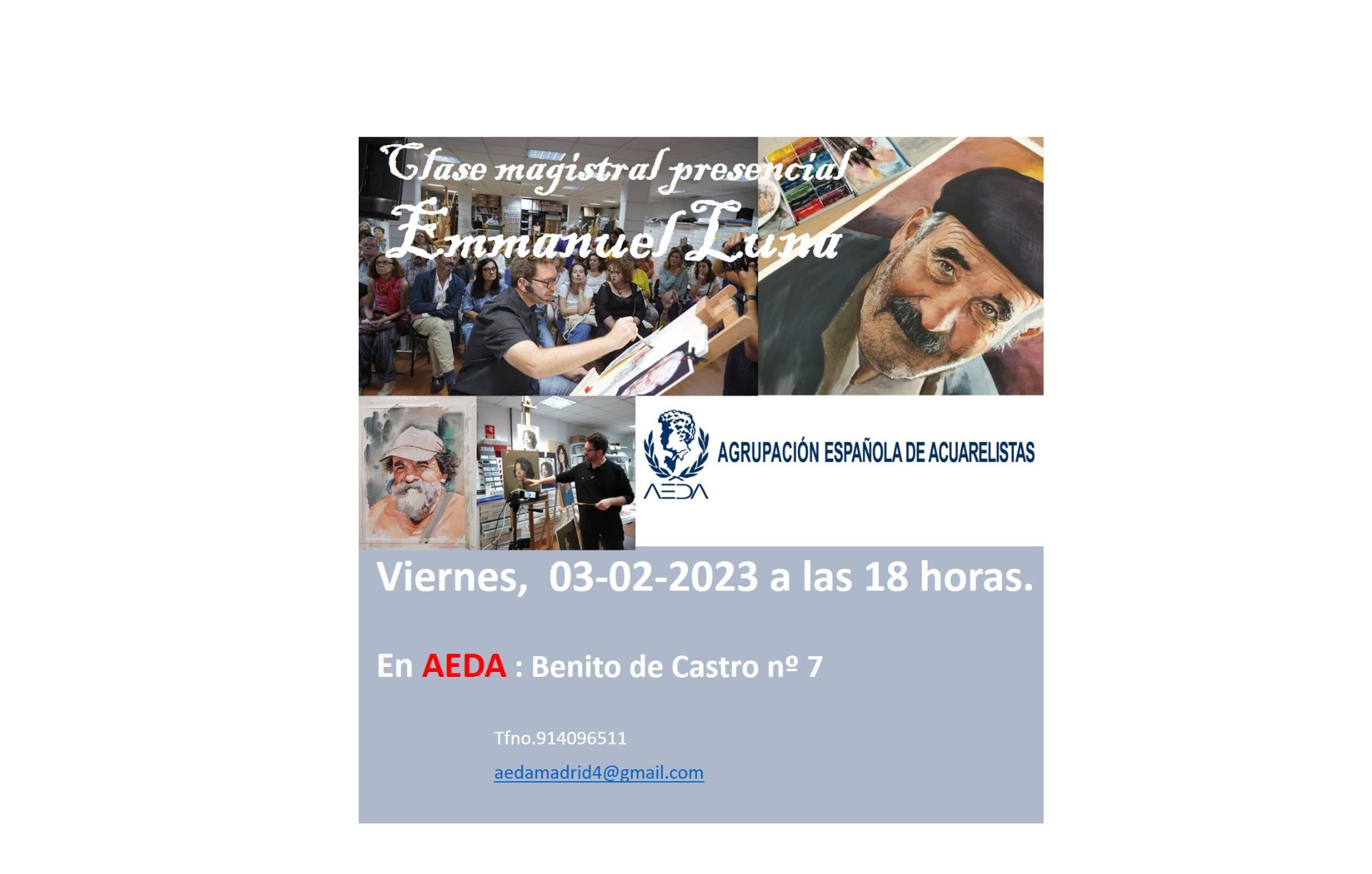 Os anunciamos que el viernes 3 de febrero, el maestro acuarelista EMMANUEL LUNA, impartirá una clase magistral presencial en AEDA. Ver más detalles en el cartel.
