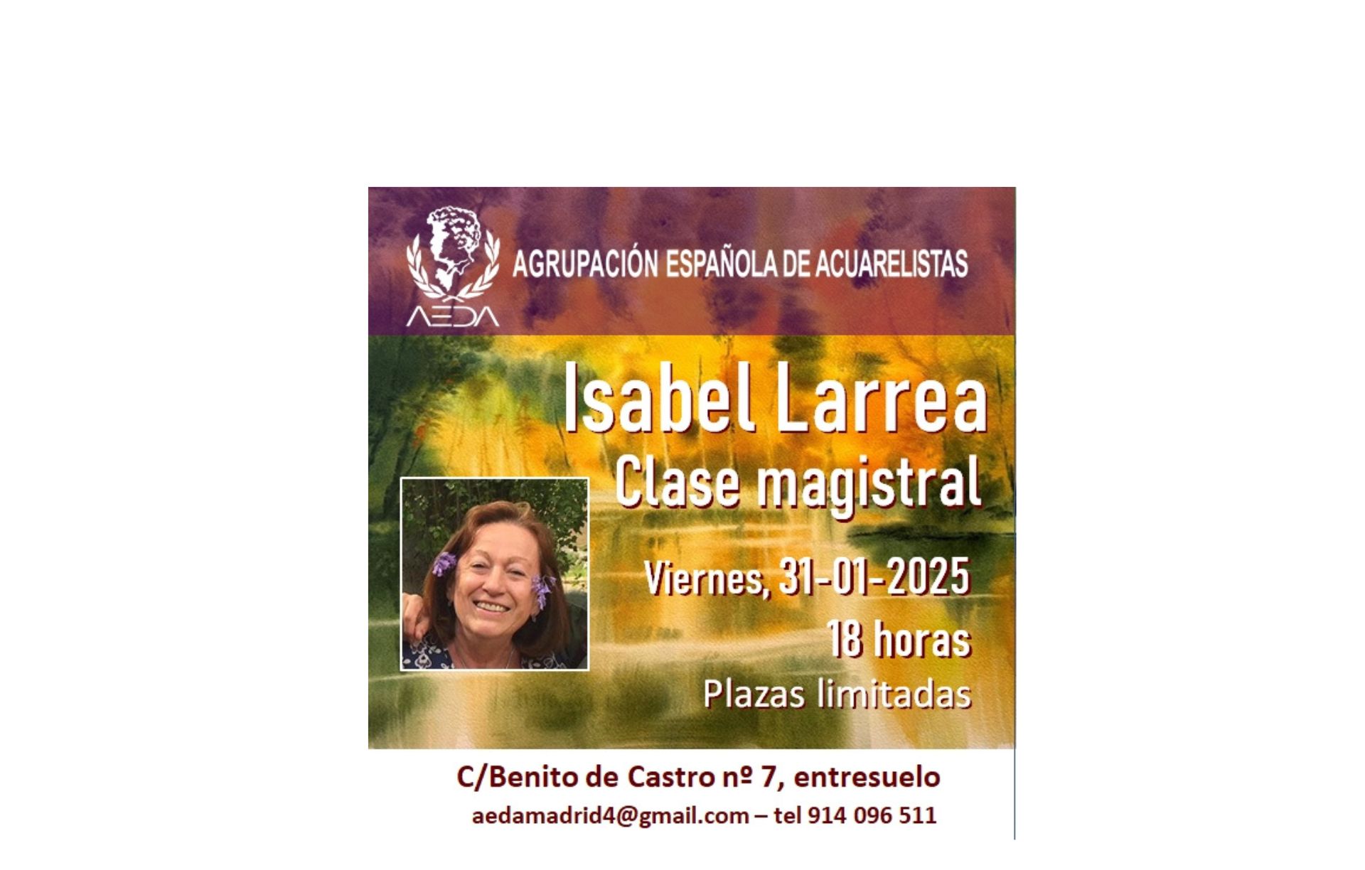 Nos es grato anunciaros que el próximo viernes 31 de enero de 2025, a las 18:00 horas, ISABEL LARREA va a impartir una clase magistral presencial en el aula principal de nuestra sede en c/ Benito de Castro 7 , entresuelo de Madrid.