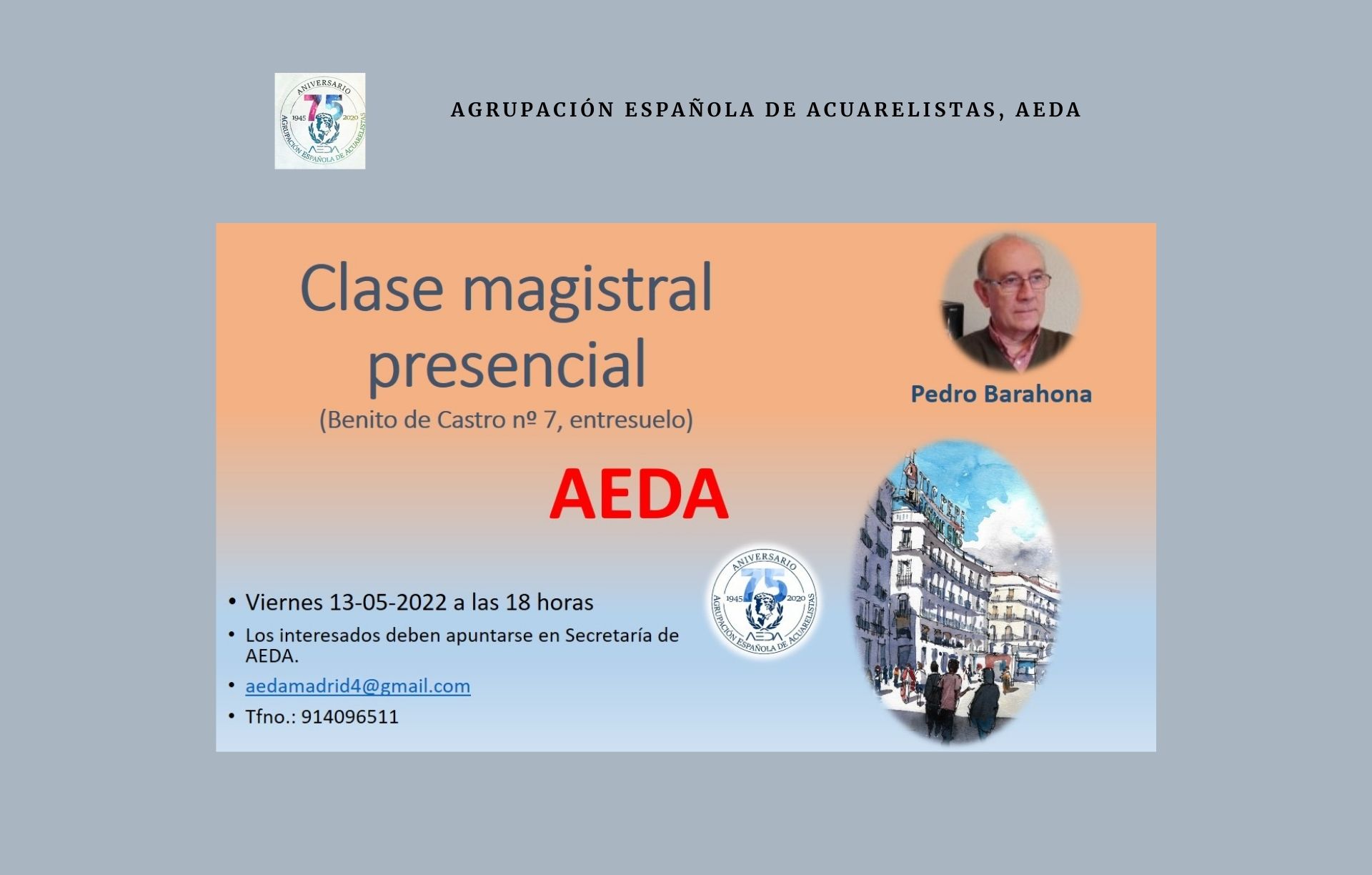 Queridos amigos, Os recordamos la próxima clase magistral presencial que impartirá PEDRO BARAHONA el viernes 13 de mayo de 2022, a las 18:00h, en nuestra sede de c/ Benito Castro 7 entreplanta. Los interesados en asistir deben apuntarse previamente en Secretaría. Un saludo La Junta Directiva de AEDA