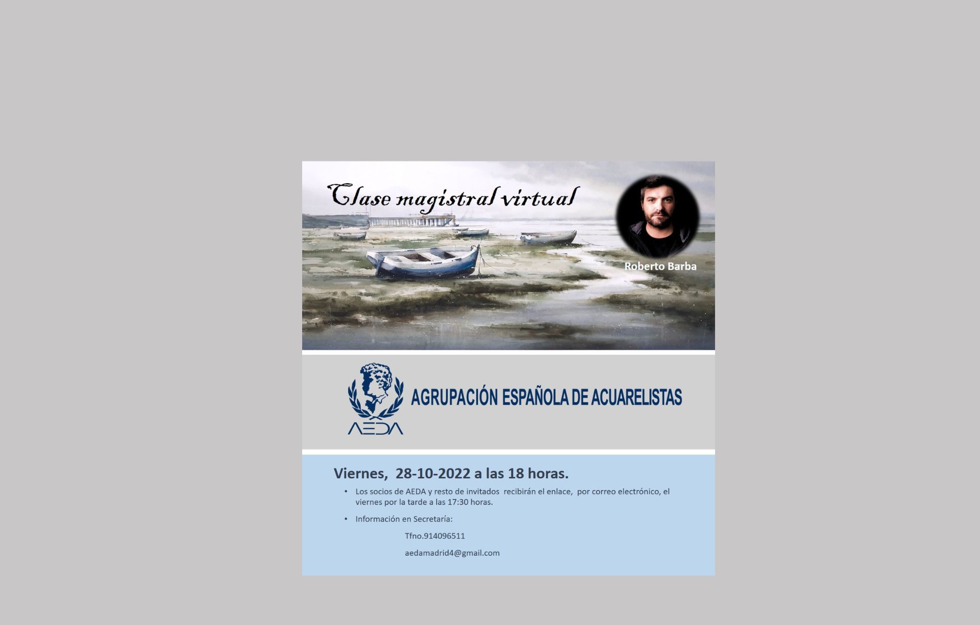 Reanudamos las clases magistrales, vía Zoom, de maestros acuarelistas. En esta ocasión, 28-10-22, tendremos a Roberto Barba, joven acuarelista andaluz que destaca por su maestría. En el cartel adjunto se indican los datos necesarios.