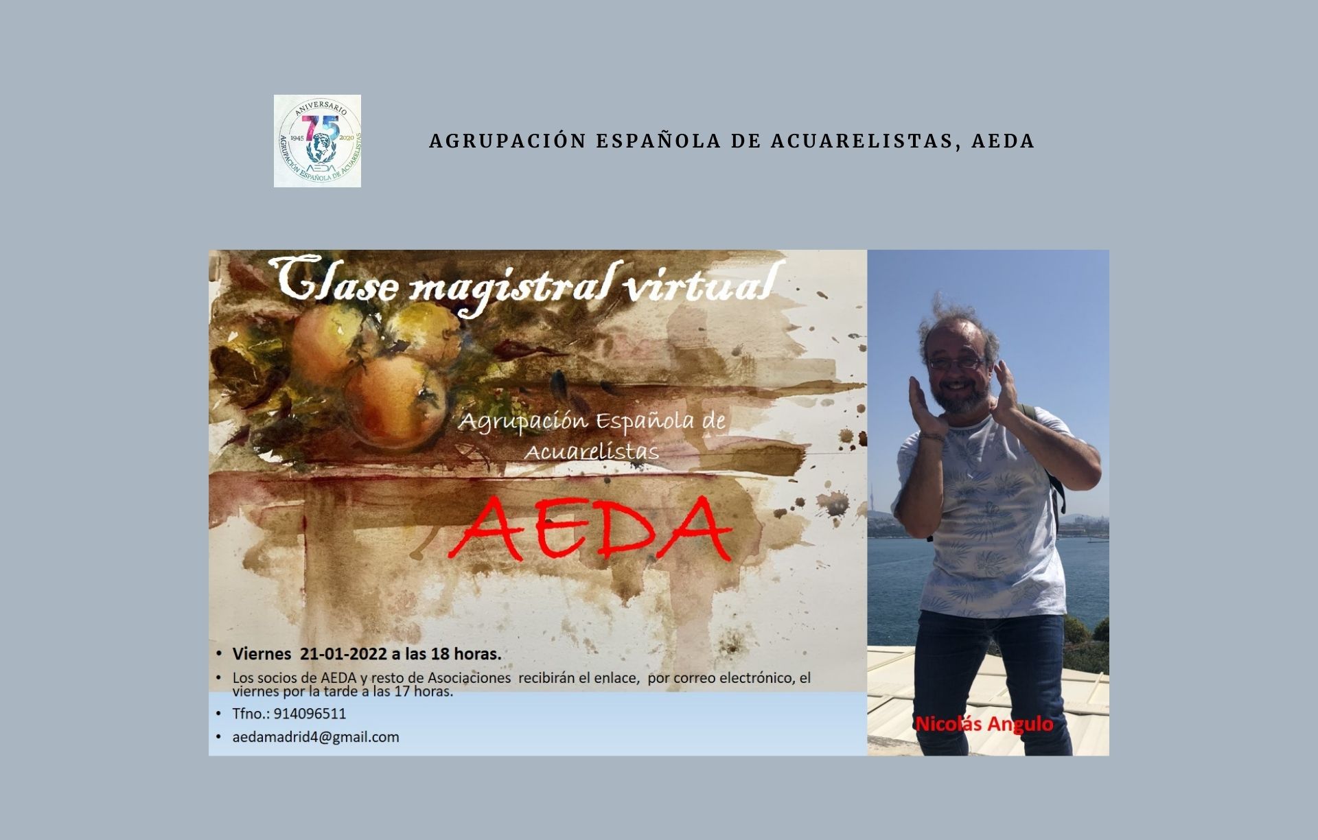 Queridos amigos: os invitamos a participar en la clase magistral virtual que impartirá el maestro acuarelista Nicolás Angulo, el próximo 21-01-2022, a las 18 horas. Como habitualmente se os enviará el enlace sobre las 17 horas del mismo día.