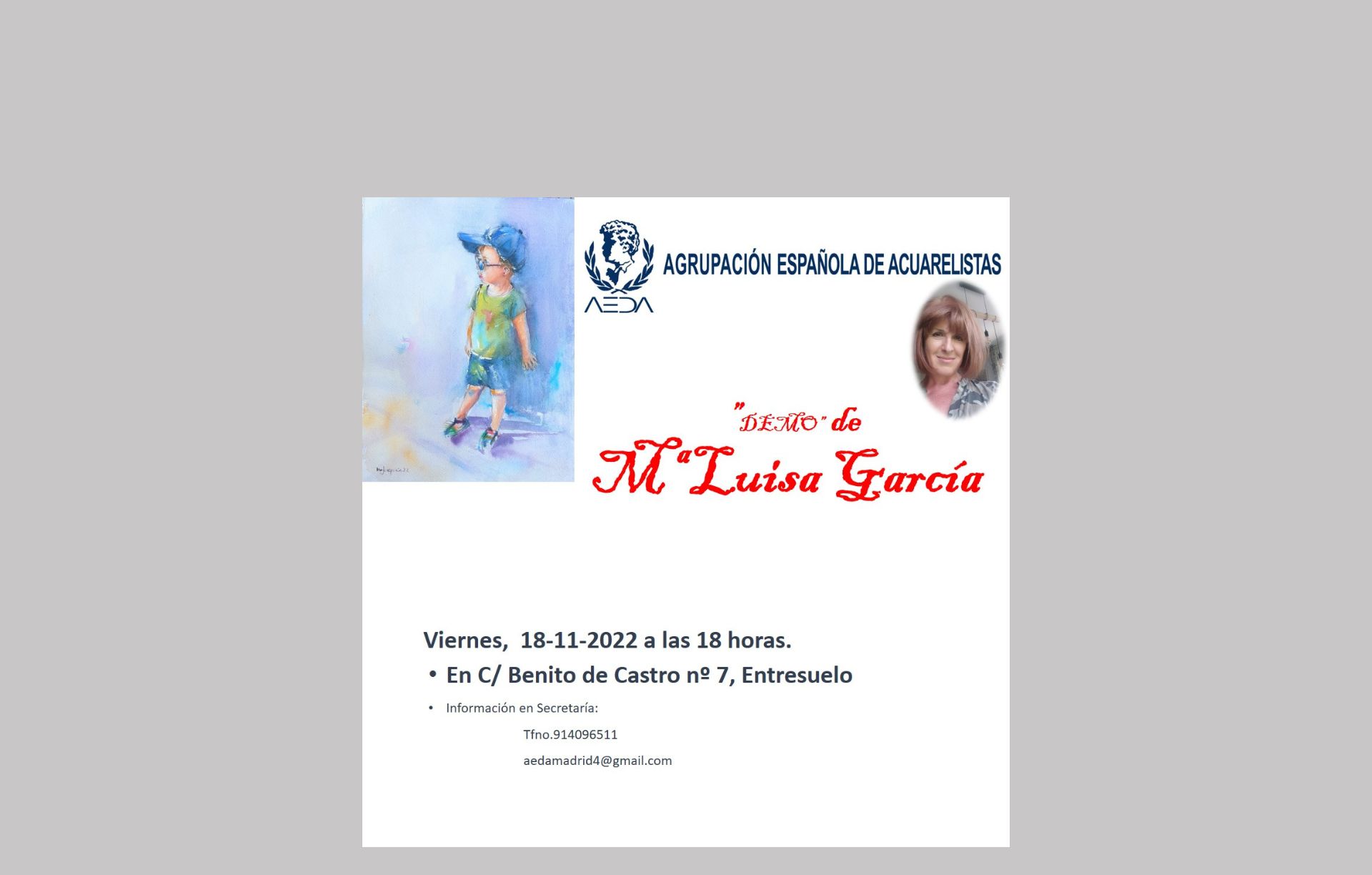 El próximo viernes 18 de noviembre, en nuestras salas de Benito de Castro nº7, entreplanta, a las 18 horas, hará una demo la magnífica acuarelista Mª Luisa García.