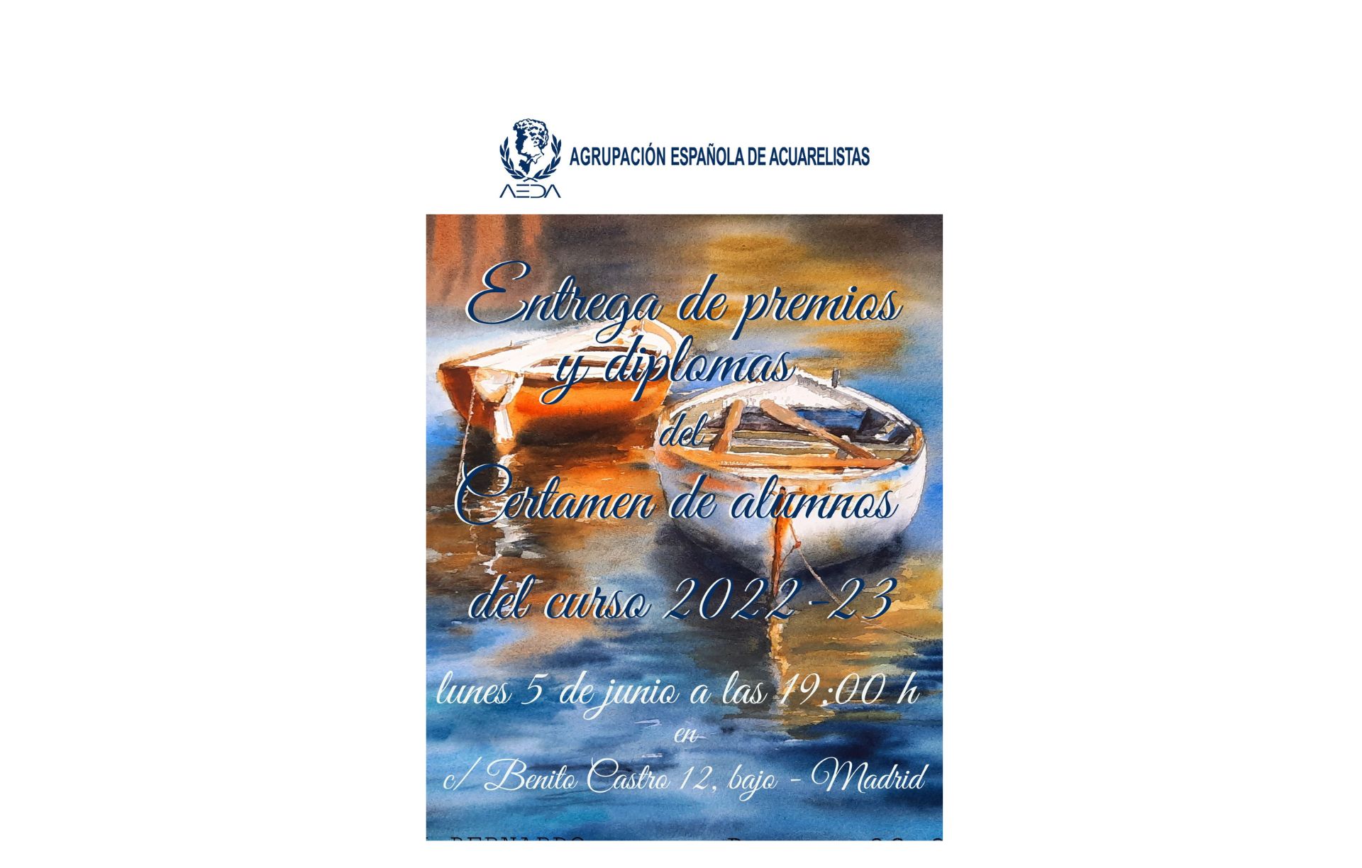 Nos es grato informaros que el próximo lunes 5 de junio va a tener lugar, a las 19:00 horas, la entrega de premios y diplomas del «III Certamen de ALUMNOS de AEDA del curso 2022-23» en la sala de exposiciones «Esteve Botey» de nuestra sede en c/Benito Castro 12, bajo – Madrid.