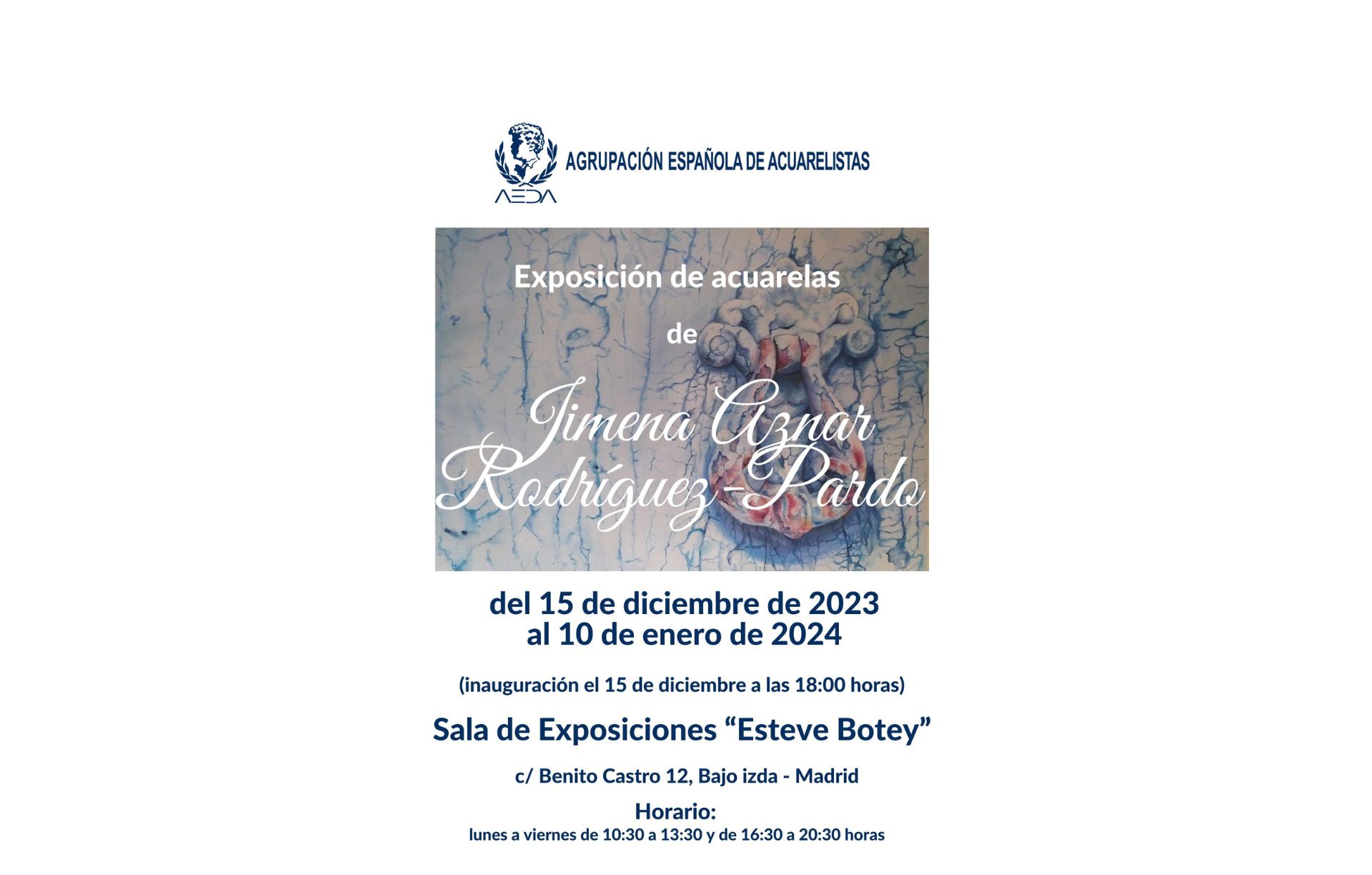 La Agrupación Española de Acuarelistas se complace en invitaros a la inauguración de la exposición de acuarelas de JIMENA AZNAR RODRÍGUEZ-PARDO, que va a tener lugar el próximo viernes 15 de diciembre a las 18:00 horas, en la Sala de Exposiciones «Esteve Botey» de nuestra sede, sita en c/ Benito de Castro 12, bajo izda. de Madrid.