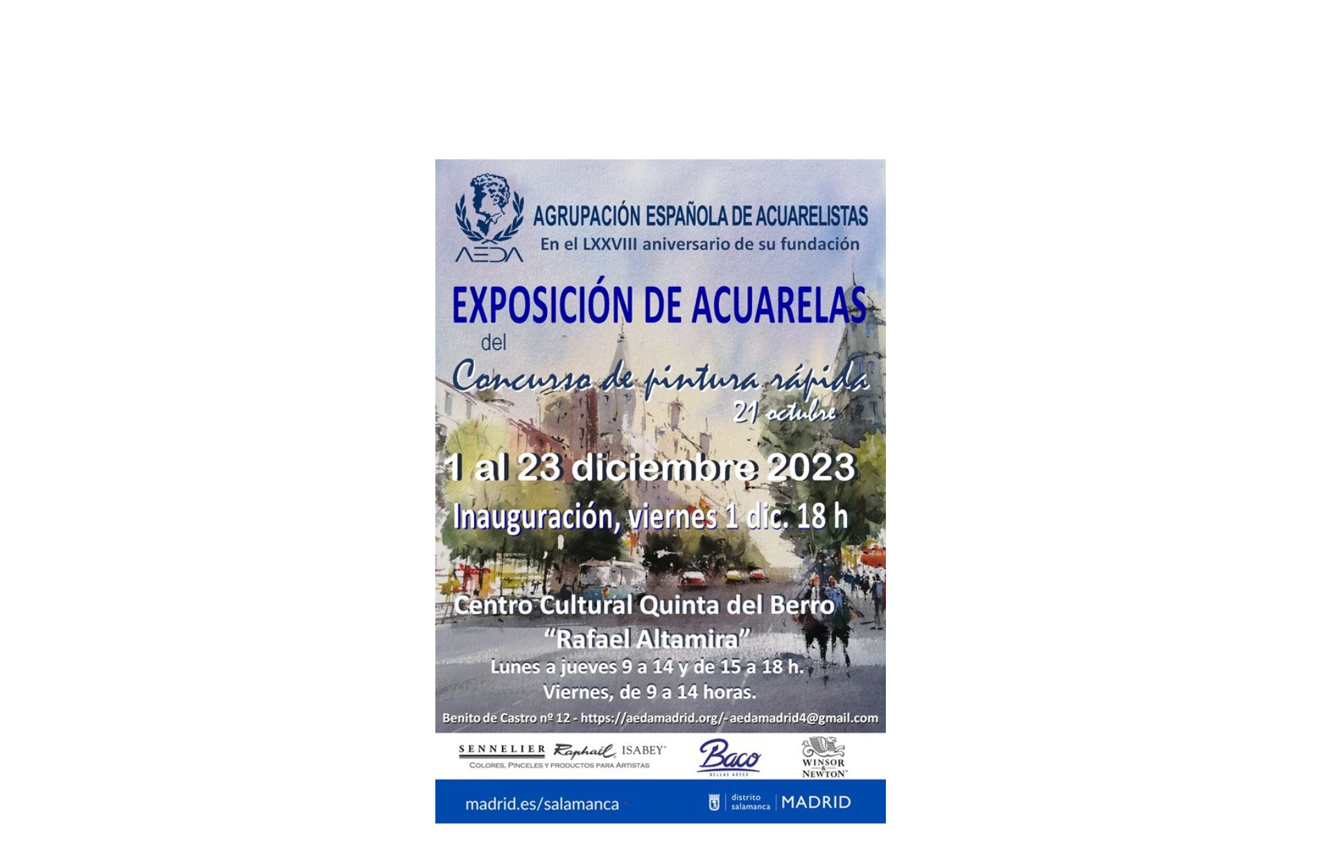 La Agrupación Española de Acuarelistas, en su LXXVIII aniversario de su fundación, se complace en invitaros a la inauguración de la Exposición de Acuarelas del «1er Concurso de Pintura Rápida de AEDA«, que va a tener lugar el próximo viernes 1 de diciembre a las 18:00 horas, en el Centro Cultural Quinta del Berro «Rafael Altamira», sito en c/ Enrique D´Almonte 1 – Madrid.