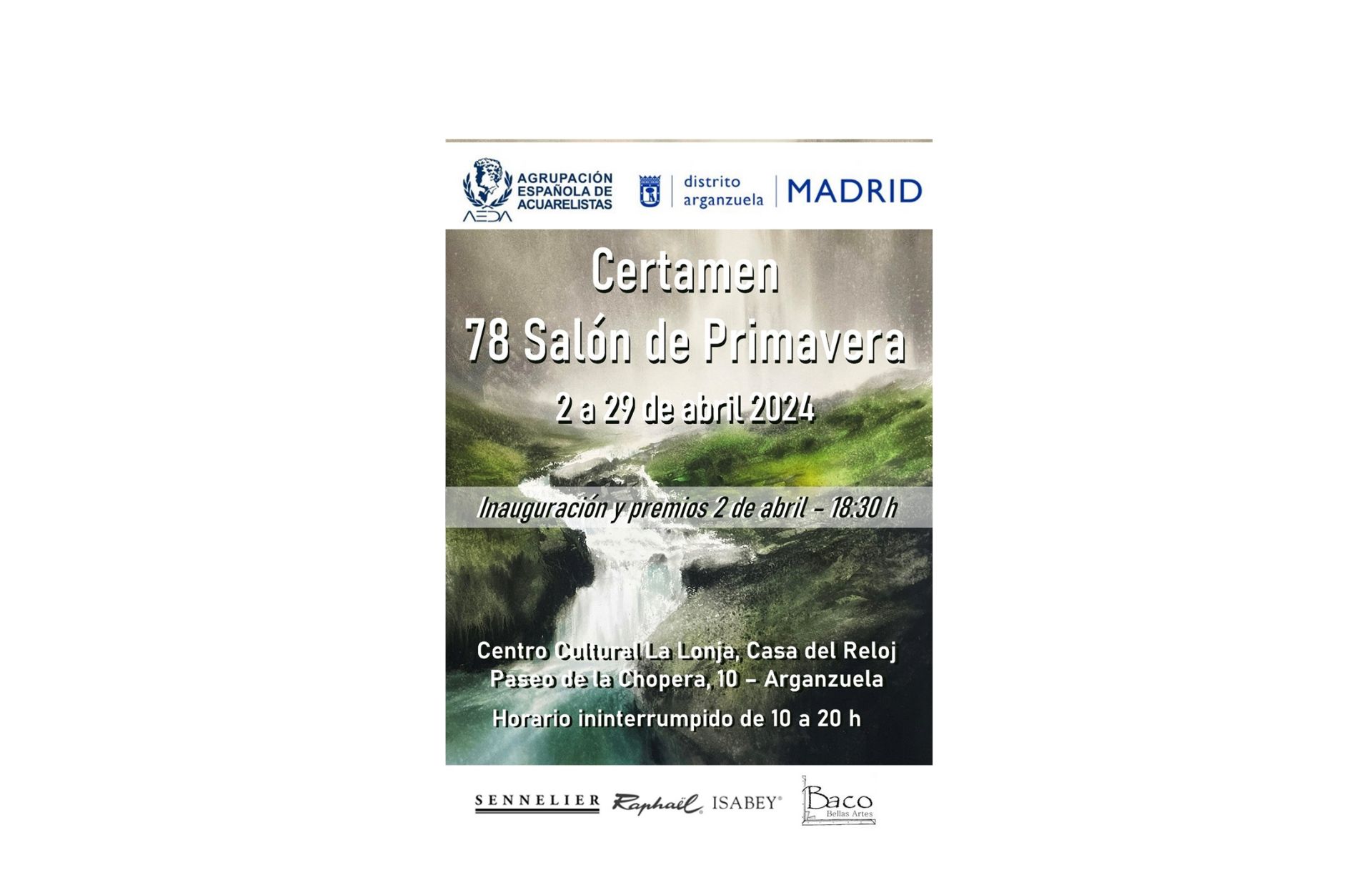 La Agrupación Española de Acuarelistas tiene el placer de invitaros a la inauguración y entrega de premios del «78 SALÓN DE PRIMAVERA» de AEDA, que se va a celebrar el viernes 2 de abril de 2024, a las 18:30 horas, en la Sala de Exposiciones del Centro Cultural La Lonja, Casa del Reloj, Paseo de la Chopera 10 – Madrid.