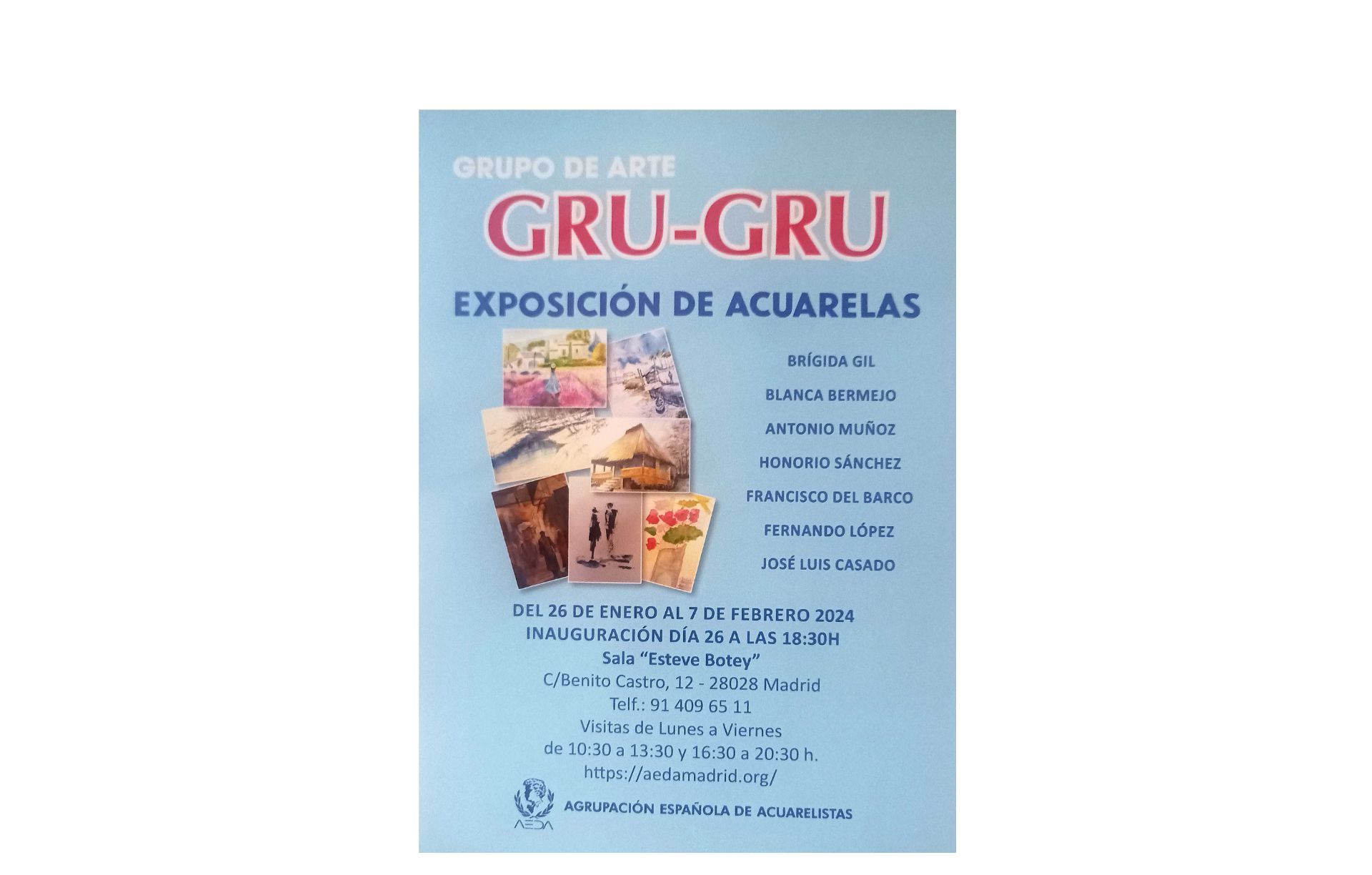 La Agrupación Española de Acuarelistas se complace en invitaros a la inauguración de la exposición de acuarelas del Grupo de Arte «GRU-GRU», que va a tener lugar el próximo viernes 26 de enero de 2024, a las 18:30 horas, en la Sala de Exposiciones «Esteve Botey» de nuestra sede, sita en c/ Benito de Castro 12, bajo izda. de Madrid.