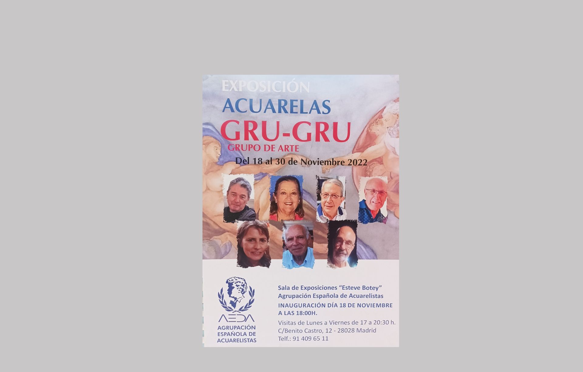 La Agrupación Española de Acuarelistas se complace en invitaros a la inauguración de la exposición del GRUPO GRU-GRU, que va a  va a tener lugar este próximo viernes 18 de noviembre a las 18:00h, en la Sala de Exposiciones «Esteve Botey» de nuestra sede, sita en c/Benito Castro 12, bajo izda de Madrid.