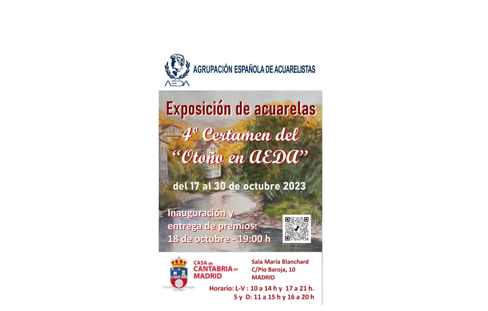 La Agrupación Española de Acuarelistas tiene el placer de invitaros a la inauguración y entrega de premios y diplomas de la exposición de acuarelas del IV Certamen del «Otoño en AEDA» que se va a celebrar el miércoles 18 de octubre de 2023, a las 19:00 horas, en la Sala de Exposiciones «María Blanchard» de la Casa de Cantabria de Madrid, sita en c/ Pío Baroja 10.