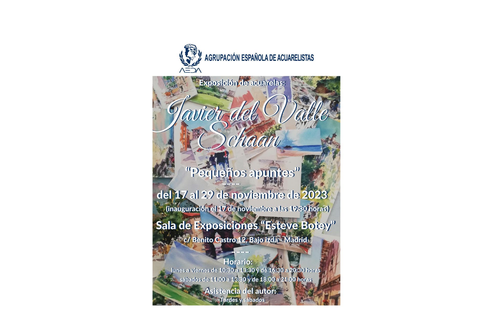 La Agrupación Española de Acuarelistas se complace en invitaros a la inauguración de la exposición de acuarelas: «Pequeños apuntes» de JAVIER DEL VALLE SCHAAN, que va a tener lugar el próximo viernes 17 de noviembre a las 19:30 horas, en la Sala de Exposiciones «Esteve Botey» de nuestra sede, sita en c/ Benito Castro 12, bajo izda. de Madrid.