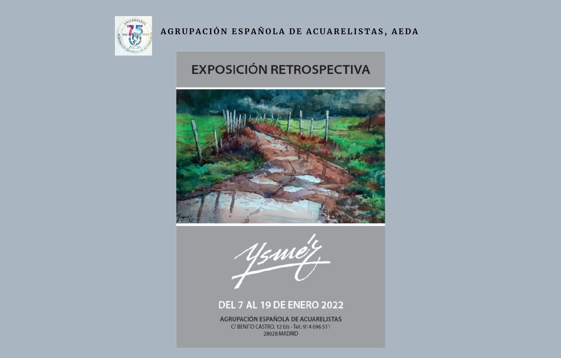 La Agrupación Española de Acuarelistas tiene el placer de invitaros a la exposición de acuarelas s de JOSÉ YSMER, que tendrá lugar en la Sala “Esteve Botey” de AEDA, sita en c/ Benito Castro 12 , Bajo izquierda – Madrid, del viernes 7 de enero al miércoles 19 de enero de 2022.