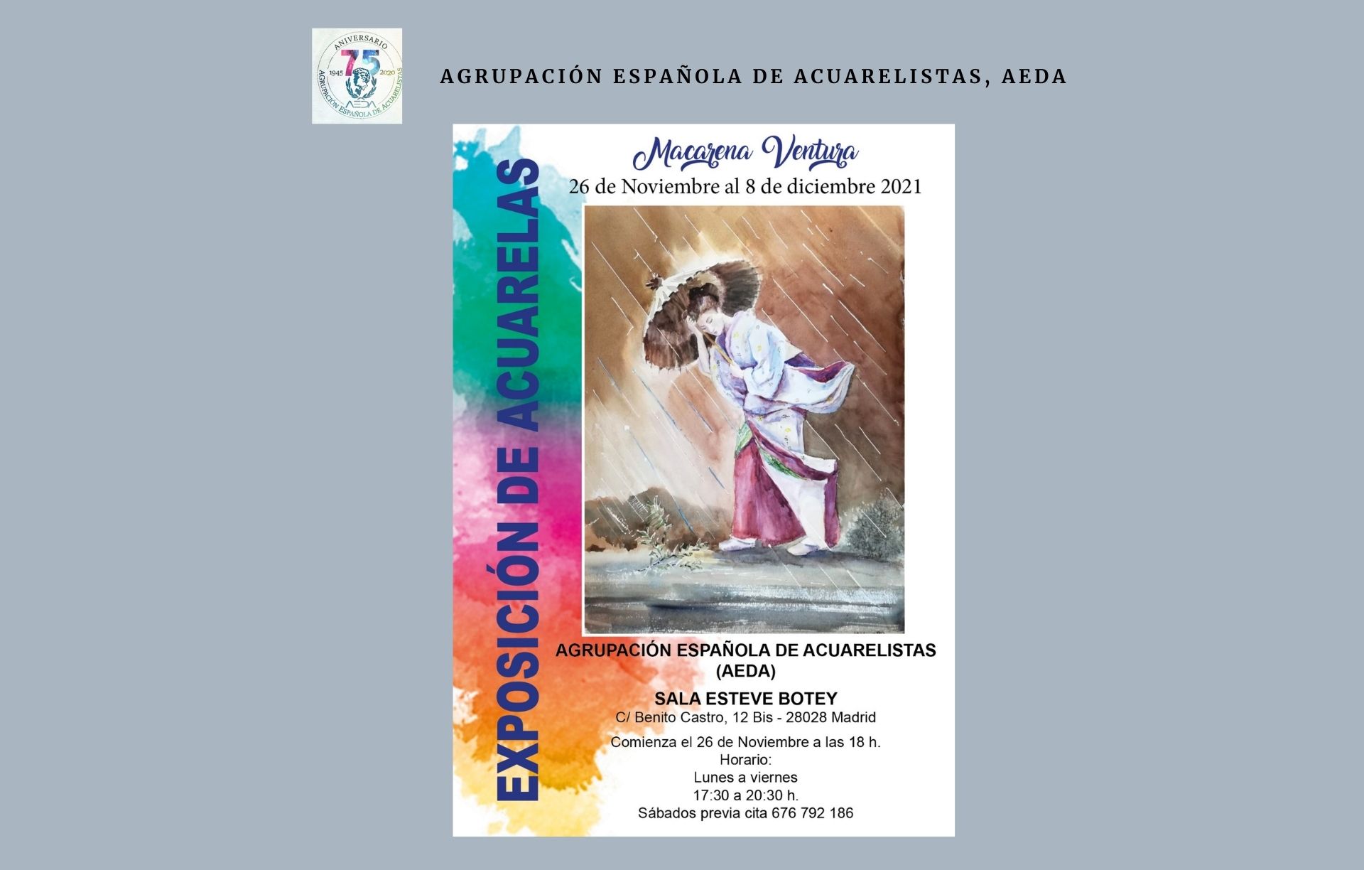 La Agrupación Española de Acuarelistas tiene el placer de invitaros a la exposición de acuarelas s de Macarena Ventura, que tendrá lugar en la Sala “Esteve Botey” de AEDA, sita en c/ Benito Castro 12 , Bajo izquierda – Madrid, del viernes 26 de noviembre al miércoles 8 de diciembre de 2021.