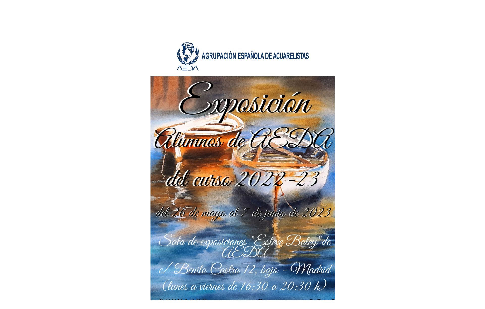 La Agrupación Española de Acuarelistas se complace en invitaros a la inauguración de la exposición de acuarelas del «Certamen de ALUMNOS de AEDA – curso 2022-23» , que va a va a tener lugar el próximo viernes 26 de mayo a las 20:00 horas, en la Sala de Exposiciones «Esteve Botey» de nuestra sede, sita en c/Benito Castro 12, bajo izda. de Madrid.