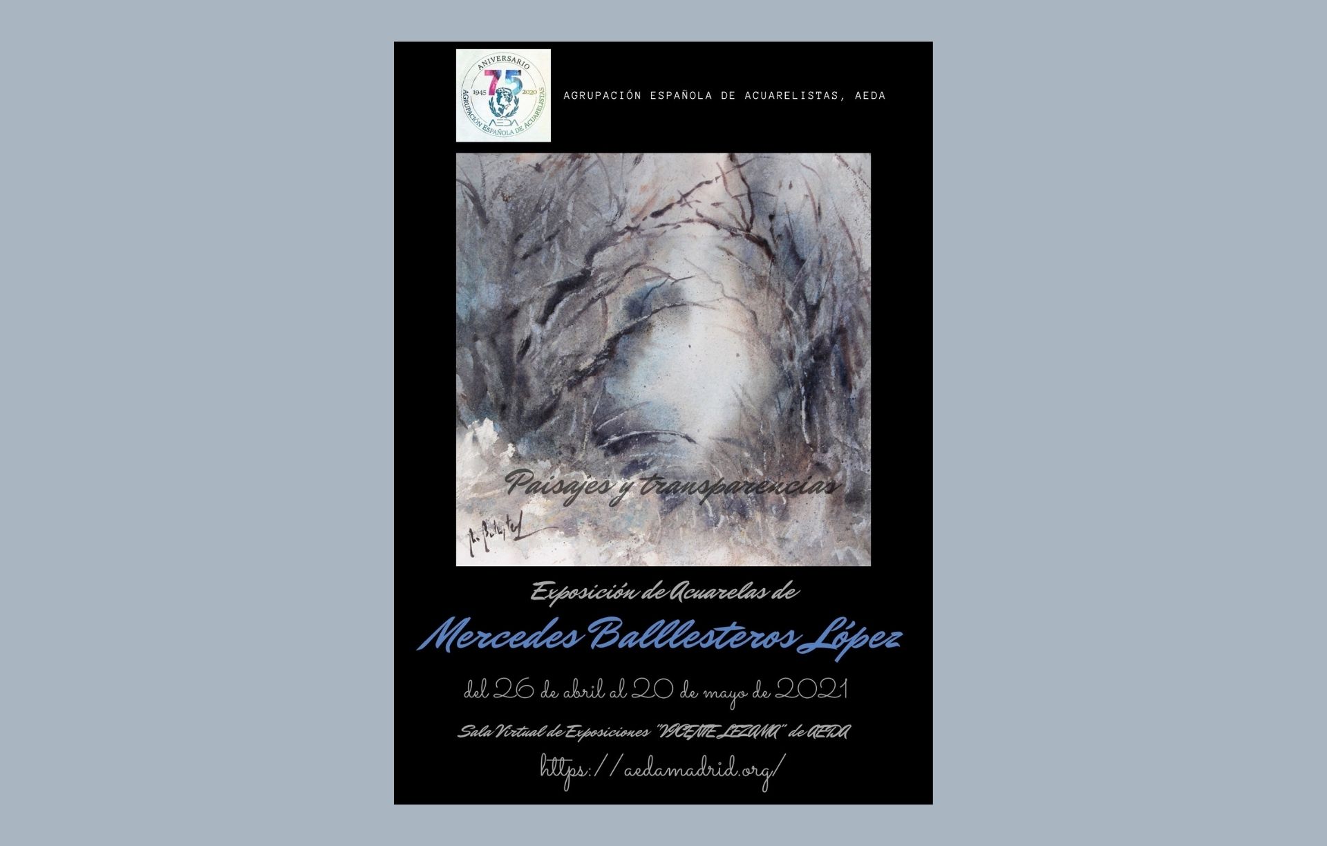 La Agrupación Española de Acuarelistas tiene el placer de invitaros a la exposición  de MERCEDES BALLESTEROS LÓPEZ  del 23 de abril al 20 de mayo de 2021,  en la Sala Virtual de Exposiciones «Vicente Lezama” de la página web de AEDA (https://aedamadrid.org/).