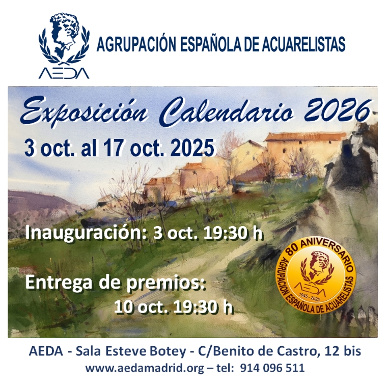 La Agrupación Española de Acuarelistas se complace en invitaros a la inauguración de la exposición de acuarelas del «Calendario 2026 de AEDA«, que tendrá lugar a las 19:30 horas del viernes 3 de octubre de 2025, en la sala de exposiciones «Esteve Botey» de la sede de AEDA, sita en la c/ Benito de Castro 12, bajo izda, de Madrid. La exposición permanecerá abierta hasta el miércoles 17 de octubre.