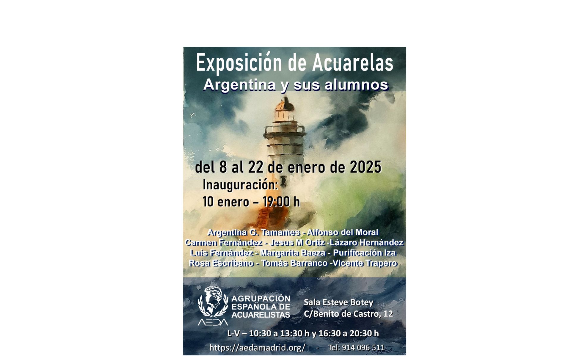La Agrupación Española de Acuarelistas se complace en invitaros a la inauguración de la exposición de acuarelas de «ARGENTINA Y SUS ALUMNOS«, que tendrá lugar, a las 19:00 horas del viernes 10 de enero de 2025, en la sala de exposiciones «Esteve Botey» de la sede de AEDA, C/ Benito de Castro 12, bajo izda, de Madrid.