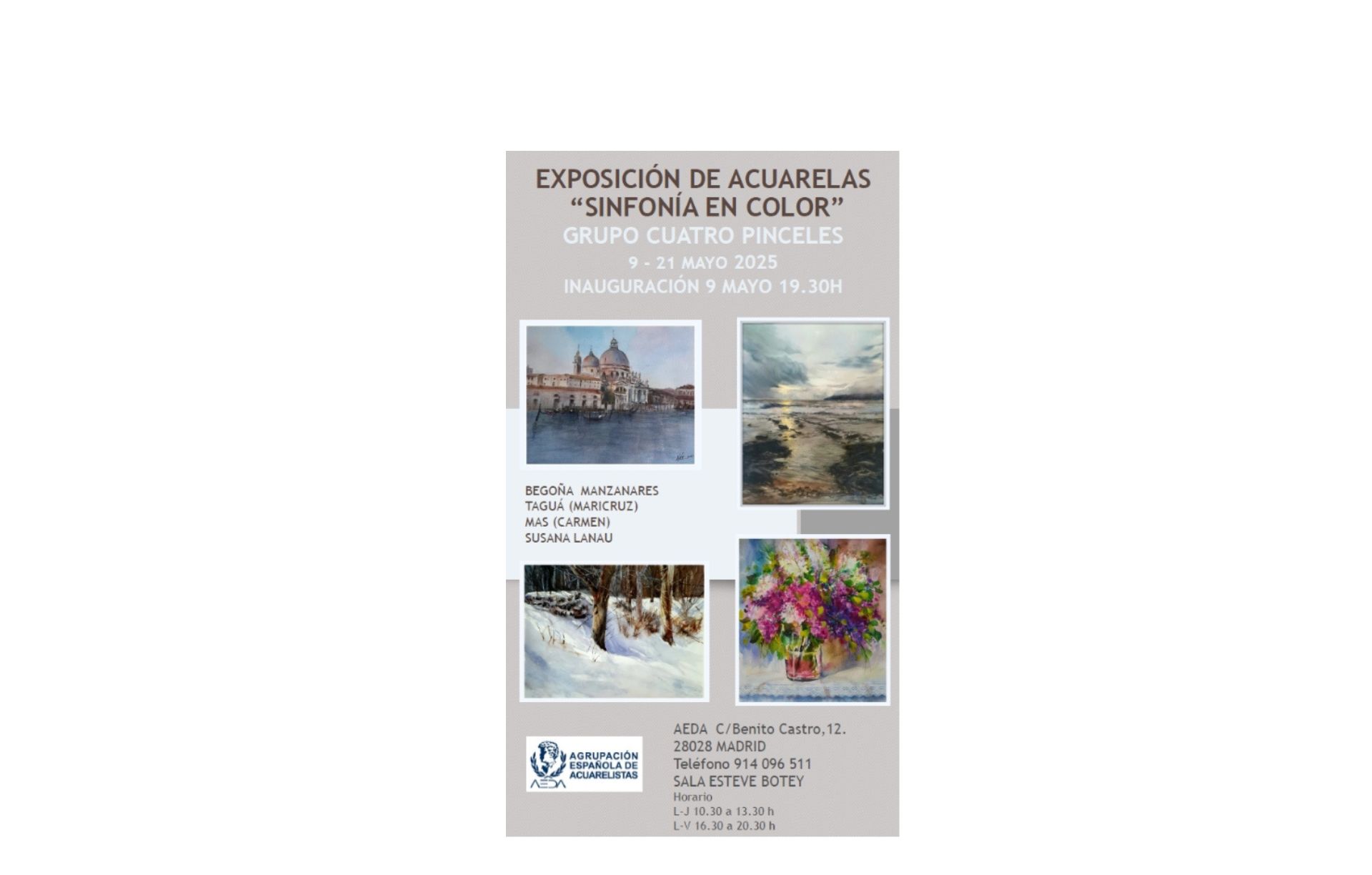 La Agrupación Española de Acuarelistas se complace en invitaros a la inauguración de la exposición de acuarelas «Sinfonía de color» del GRUPO 4 PINCELES, constituido por la socia de AEDA BEGOÑA MANZANARES y sus tres amigas TAGUÁ (MARICRUZ), MAS (CARMEN) y SUSANA LANAU.