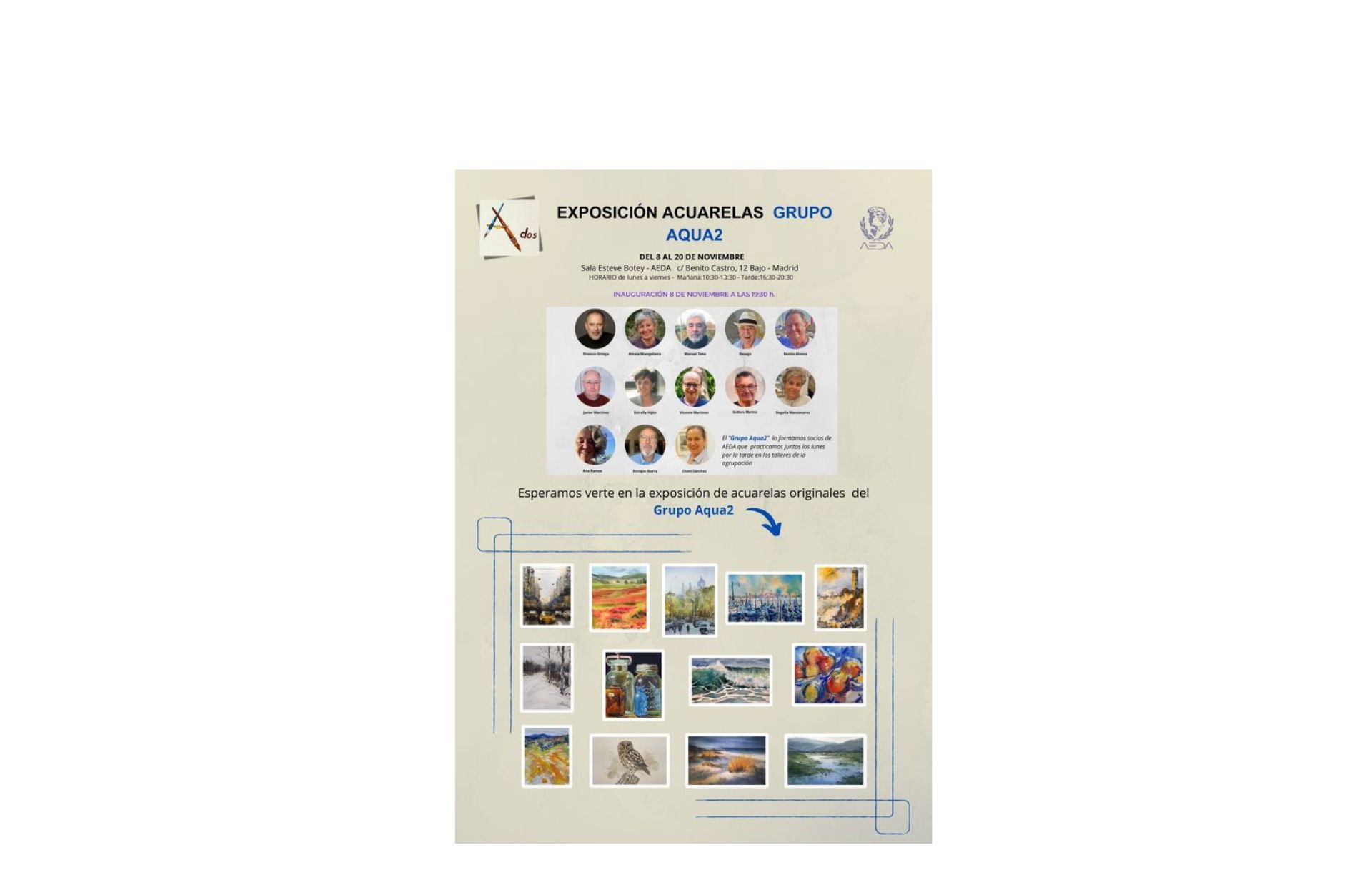 La Agrupación Española de Acuarelistas se complace en invitaros a la inauguración de la exposición de acuarelas del «Grupo AQUA2», que va a tener lugar el viernes 8 de noviembre de 2024 a las 19:30 horas, en la Sala de Exposiciones «Esteve Botey» de nuestra sede, sita en c/ Benito de Castro 12 bis, bajo izda, de Madrid.
