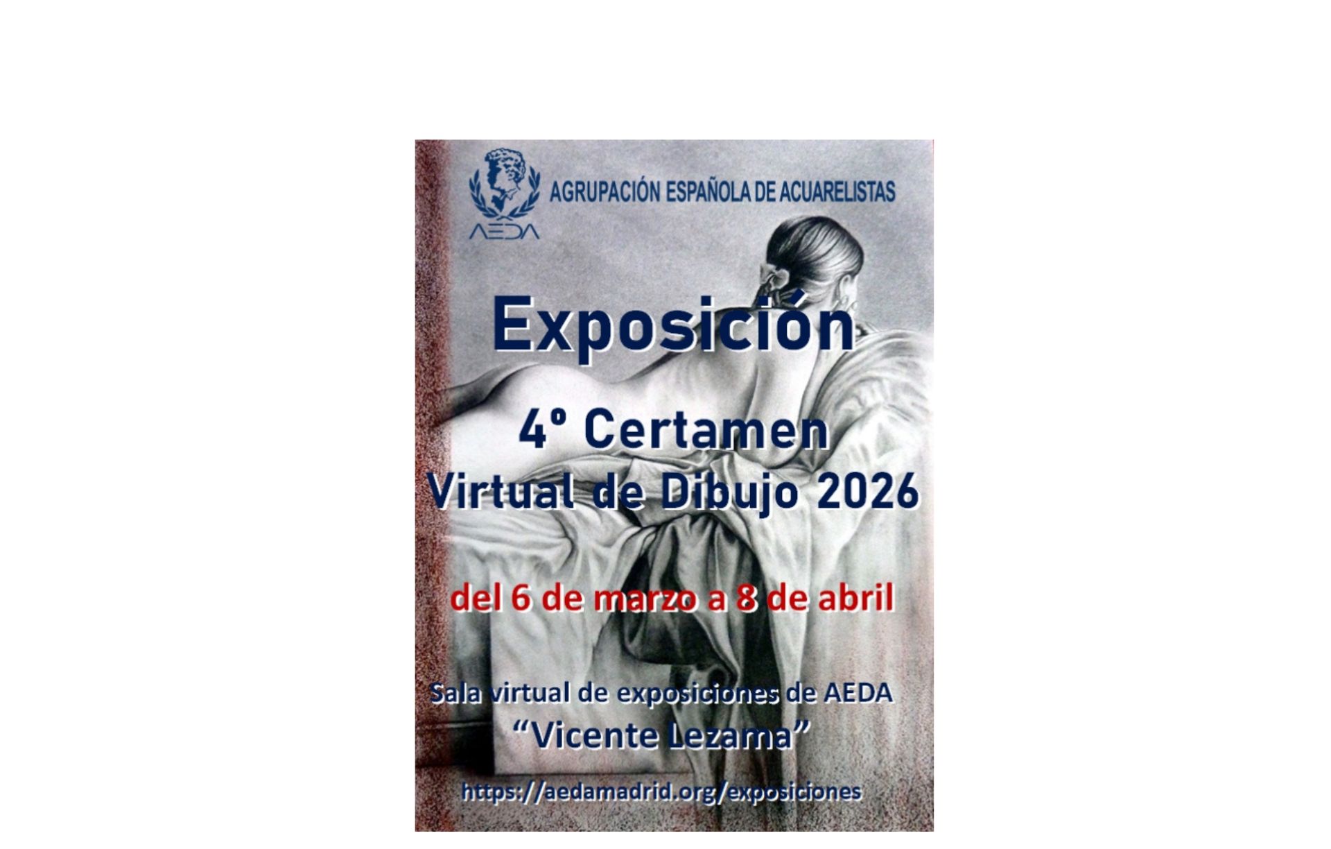 La Agrupación Española de Acuarelistas se complace en invitaros a la inauguración de la exposición del «IV Certamen Virtual de DIBUJO de AEDA – 2026», que tendrá lugar hacia las 18:00 horas del viernes 6 de marzo de 2026, en la Sala Virtual de Exposiciones «Vicente Lezama» de la página web de AEDA.