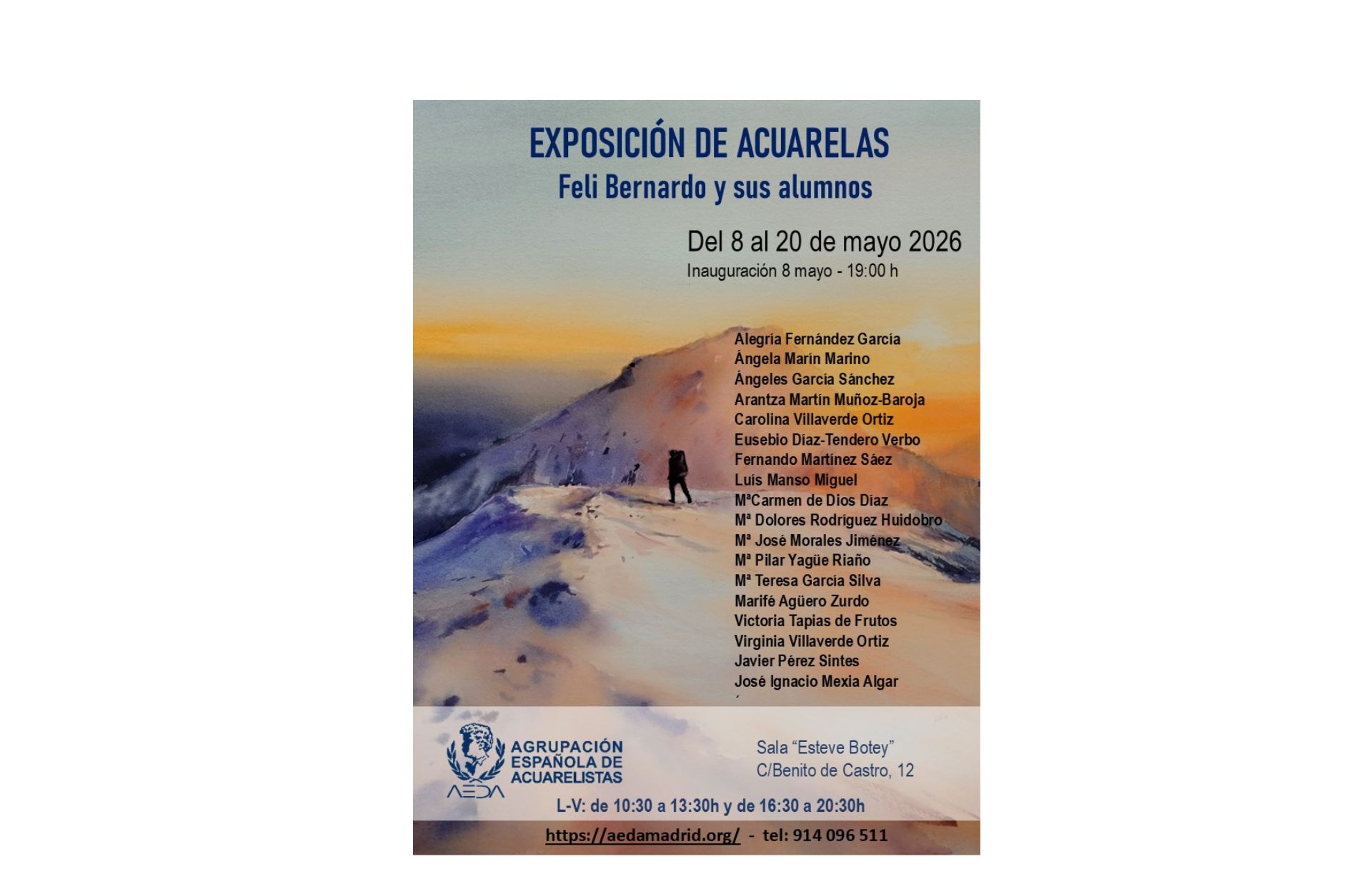 La Agrupación Española de Acuarelistas se complace en invitaros a la inauguración de la exposición de acuarelas de «FELI BERNARDO y sus Alumnos», que va a tener lugar el viernes 8 de mayo de 2026 a las 19:00 horas, en la Sala de Exposiciones «Esteve Botey» de nuestra sede, sita en c/ Benito de Castro 12 bis, bajo izda, de Madrid.