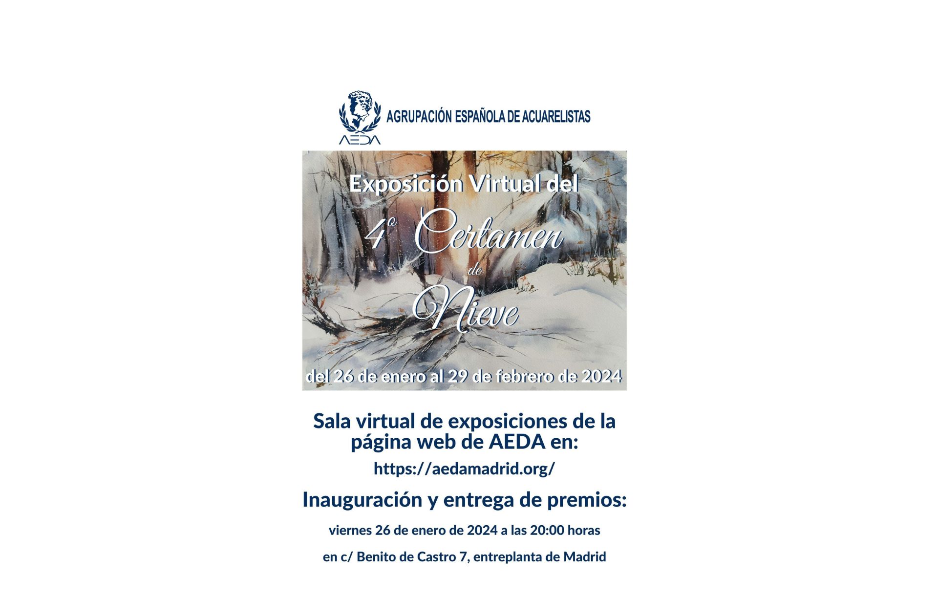 La Agrupación Española de Acuarelistas tiene el placer de invitaros a la inauguración de la IV Exposición Virtual de «NIEVE» de AEDA, que se va a celebrar en la Sala Virtual “Jaime Galdeano” de nuestra página web (en el apartado de exposiciones virtuales), a las 20:00 horas de este próximo viernes 26 de enero de 2024.