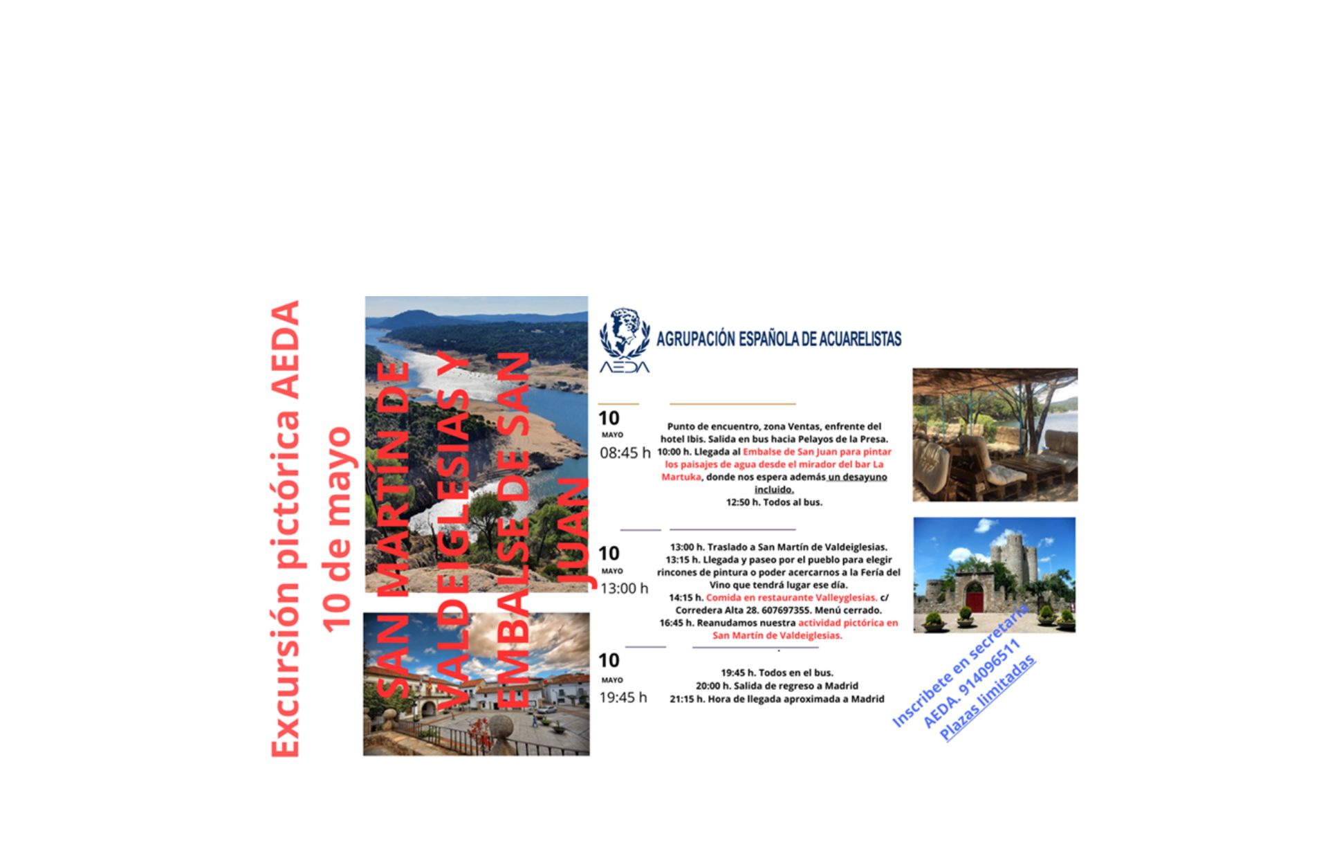 Adjunto os enviamos el Programa de la excursión pictórica de AEDA a S. Martín de Valdeiglesias y embalse de S. Juan del sábado día 10 de mayo de 2025.