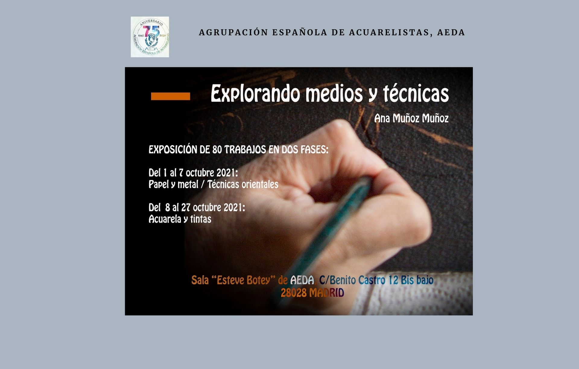 Os invitamos a visitar la nueva exposición «Explorando medios y técnicas» de ANA MUÑOZ MUÑOZ que tendrá lugar en la Sala “Esteve Botey” de AEDA, sita en c/ Benito Castro 12 , Bajo izquierda – Madrid, del 1 al 27 de octubre de 2021.