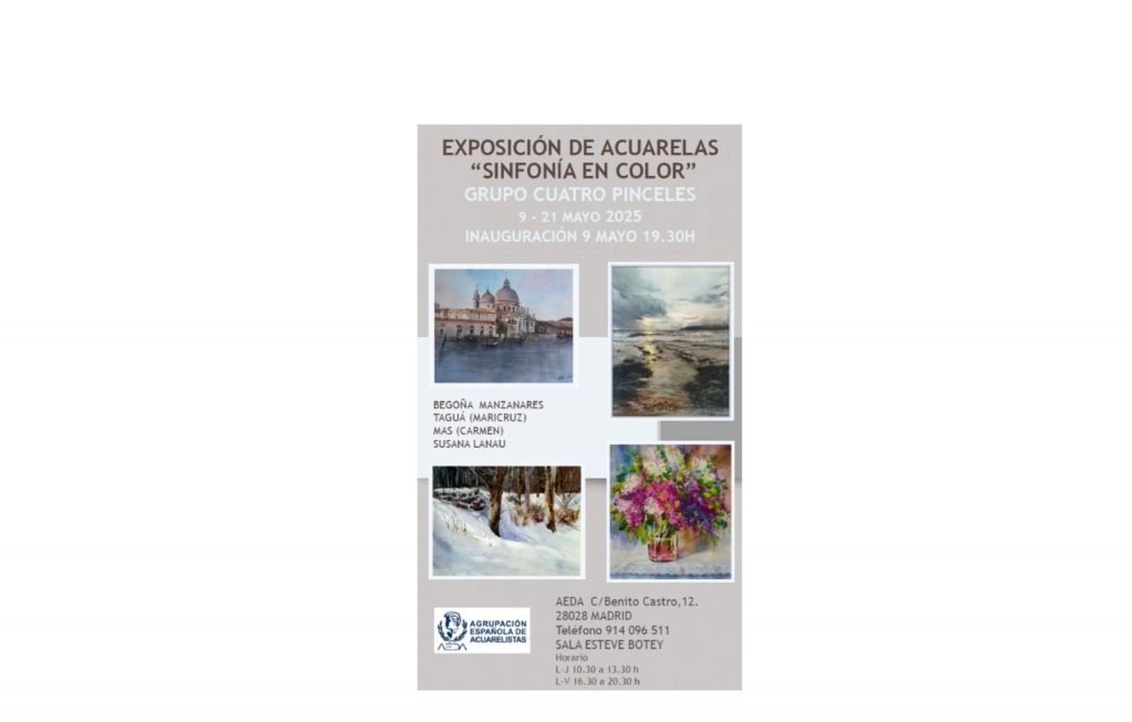 Queridos amigos, La Agrupación Española de Acuarelistas se complace en invitaros a la inauguración de la exposición de acuarelas «Sinfonía de color» del GRUPO 4 PINCELES, constituido por la socia de AEDA BEGOÑA MANZANARES y sus tres amigas TAGUÁ (MARICRUZ), MAS (CARMEN) y SUSANA LANAU. Tendrá lugar a las 19:30 horas del próximo viernes 9 de mayo de […]