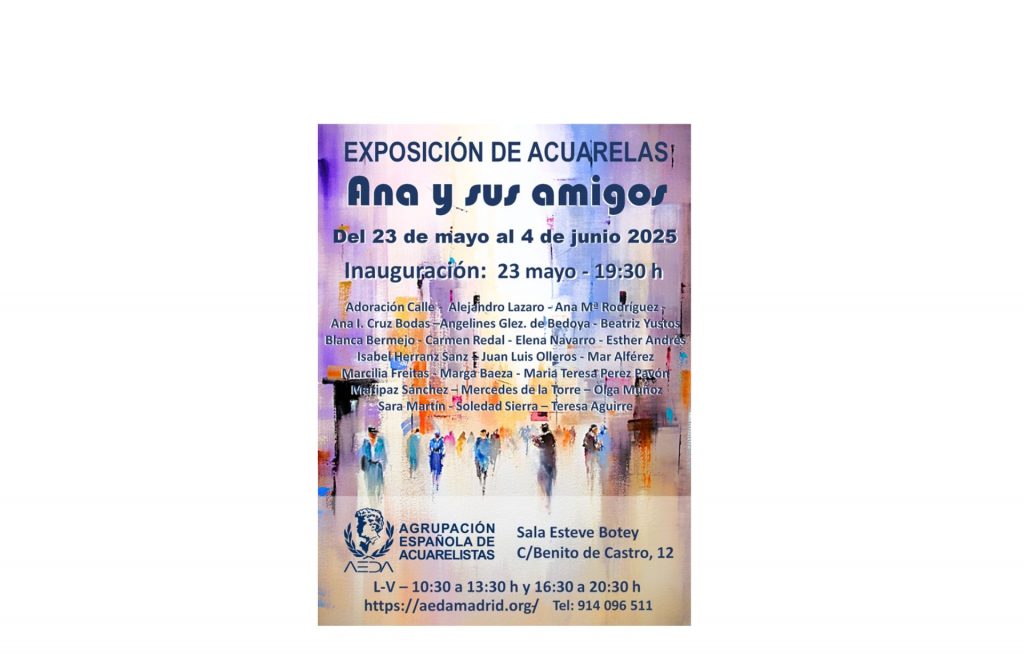 Queridos amigos, La Agrupación Española de Acuarelistas se complace en invitaros a la inauguración de la exposición de acuarelas de «ANA Y SUS AMIGOS«, que tendrá lugar el viernes 23 de mayo de 2025, en la sala de exposiciones «Esteve Botey» de la sede de AEDA, sita en la c/ Benito de Castro 12, bajo izda, de […]