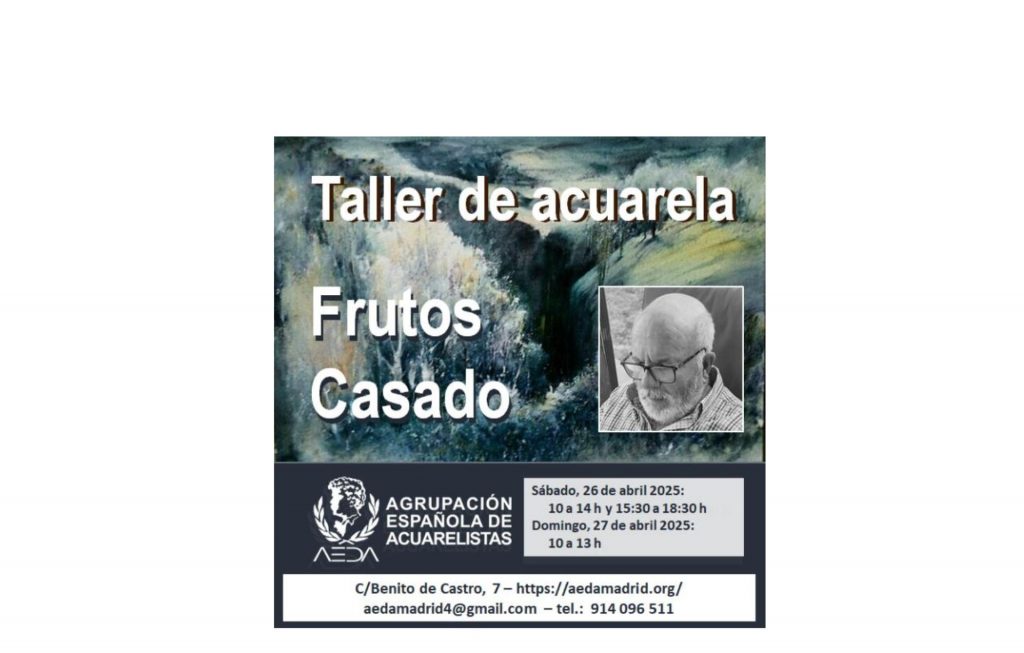 Queridos amigos, Nos es grato informaros del taller de acuarela que va a impartir FRUTOS CASADO en las instalaciones de AEDA, en c/ Benito de Castro 7 entreplanta, el sábado 26 y el domingo 27 de abril de 2025. No os perdáis esta oportunidad de trabajar con este magnífico acuarelista. Información y reserva de plazas (abierta también para NO […]