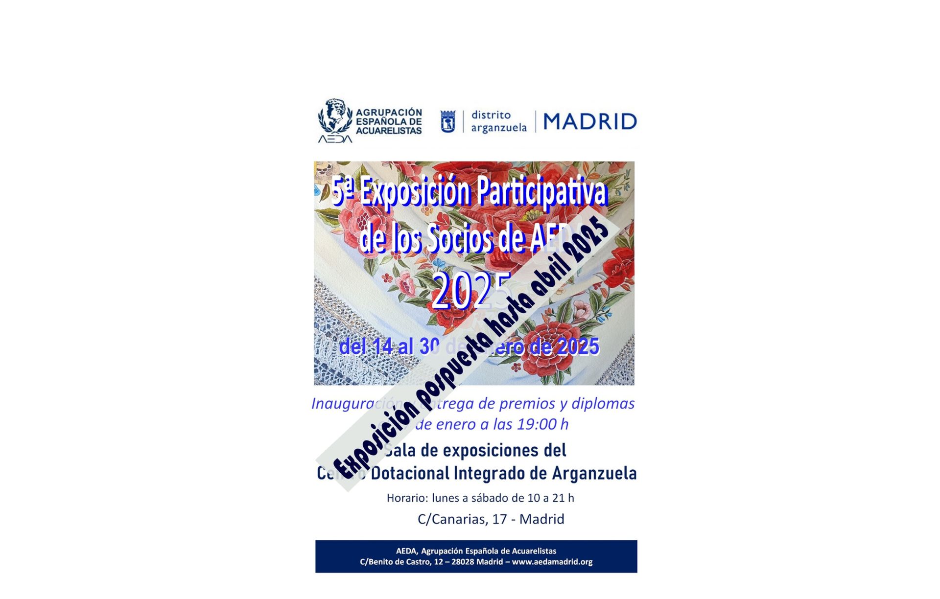 Por cambio en la disponibilidad de la sala de exposiciones del Centro Dotacional Integrado de Arganzuela, se pospone la celebración de la «5ª Exposición Participativa de los socios de AEDA» al mes de abril de 2025.