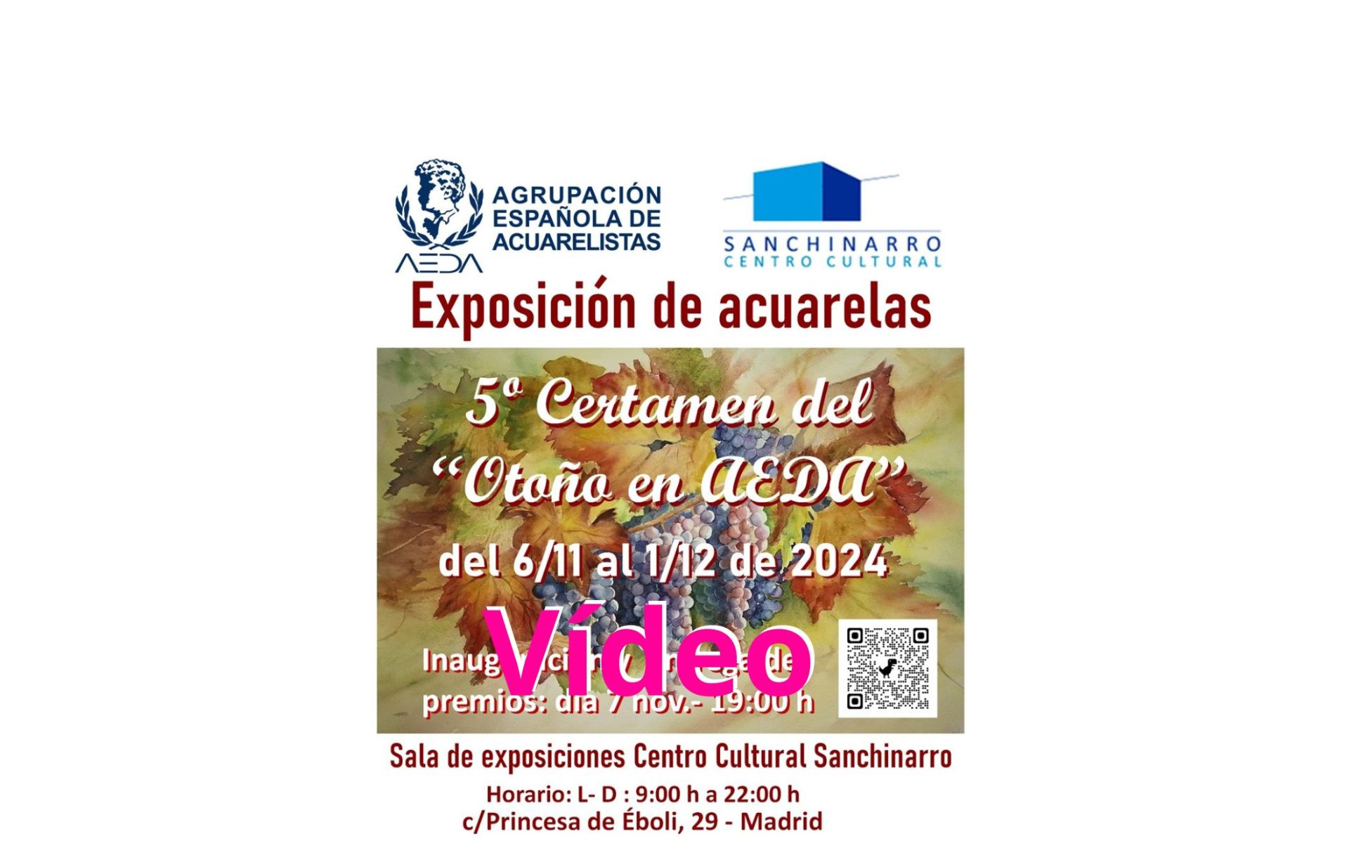 Nos complace acompañaros seguidamente el vídeo de la exposición del V Certamen del «Otoño enAEDA», que recientemente se ha celebrado en la Sala de Exposiciones del Centro Cultural Sanchinarro, situado en la c/ Princesa de Éboli 29, de Madrid.
