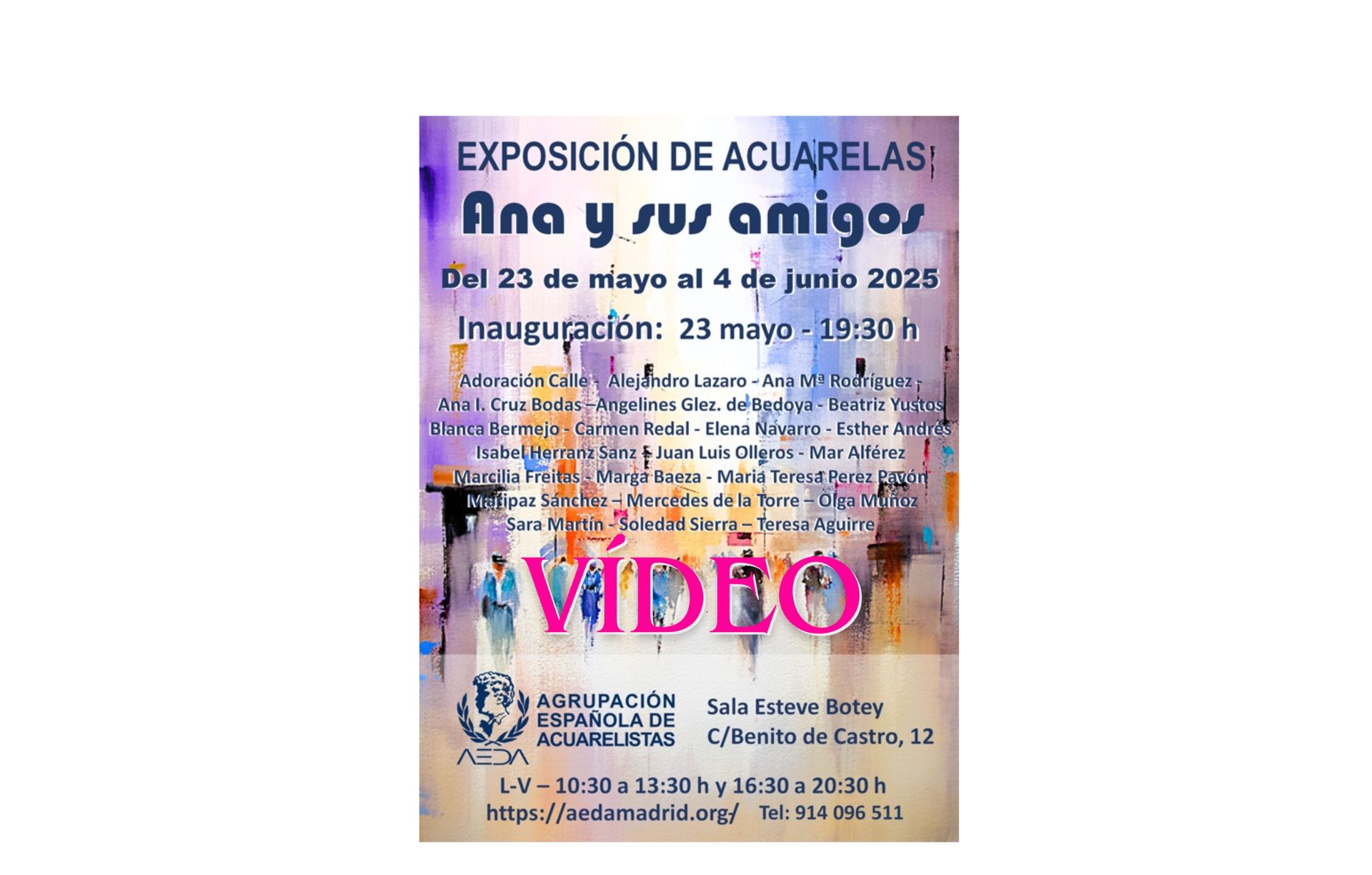 Nos complace acompañaros el vídeo de la inauguración de la exposición de acuarelas de «ANA Mª RODRÍGUEZ Y AMIGOS» en la Sala de Exposiciones «Esteve Botey» de AEDA y que podréis visitar hasta el próximo miércoles 4 de junio.