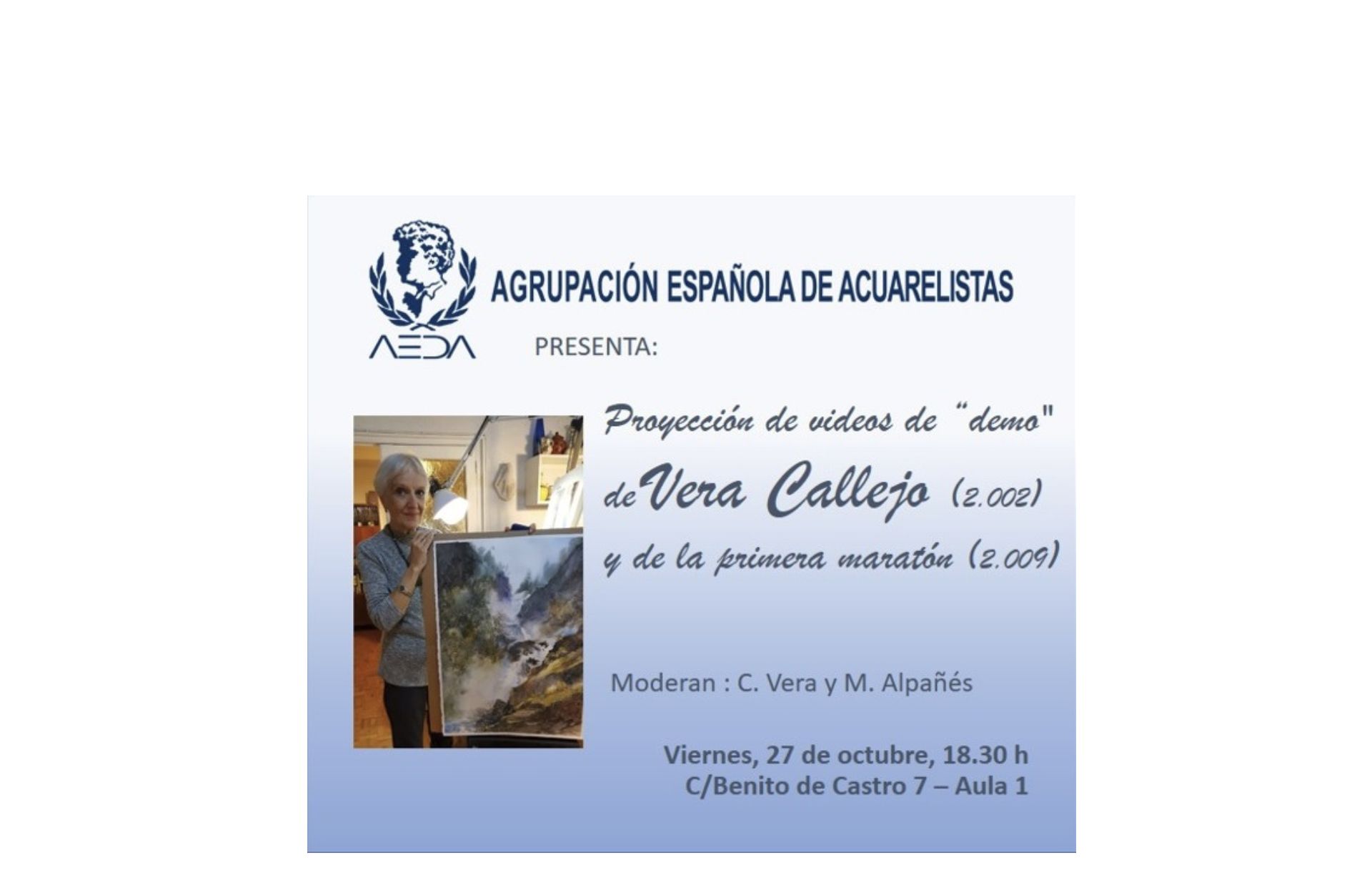 Hemos rescatado videos de eventos de AEDA de hace algunos años y consideramos que puede ser de interés recordarlos. Empezamos este viernes 27-10-23, a las 18:30 horas, con una «demo» de Vera Callejo (2.002) y con el de la celebración del primer «día mundial de la acuarela» en el 2.009 (que entonces llamábamos «maratón de acuarela»). Será a las 18.30 horas en Benito de Castro nº 7, Aula 1.
