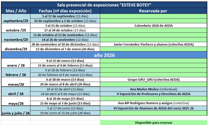 Tanto la sala ESTEVE BOTEY de nuestra sede, como la sala virtual VICENTE LEZAMA de nuestra página web, están a disposición de todos los socios, para que de manera individual o colectiva expongan sus acuarelas. También existe la modalidad de "Exposición colectiva invitada" en la que pueden participar algunos acuarelistas no socios invitados. La AEDA organiza además, en salas externas, exposiciones abiertas para todos los socios que deseen participar.